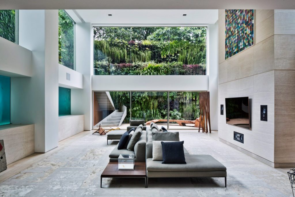A Panorama névre keresztelt kétszintes, 477 négyzetméteres villa egy házaspár megrendelésére készült, amely kifejezetten azt szerette volna, ha a medence valahogy beépül a nappaliba. Ezt az építész meg is oldotta: