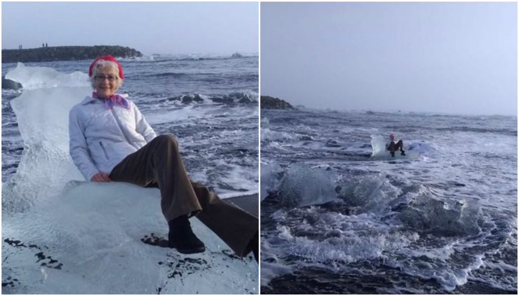 Az egyik angol nagymama is így járt. Az unoka, Catherine Streng osztotta meg Twitteren a történetet, hogy a nagyi a gyönyörű izlandi tájjal szeretett volna fotózkodni egy „jégtrónon” ülve, amikor az levált, majd jöttek a hullámok.