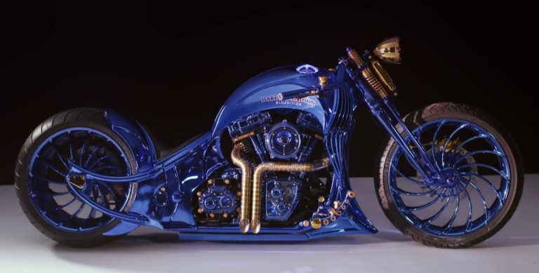A nagyon látványos, kék-arany motor egy sima, 16 ezer dolláros Harley-Davidson Softail Slim S-ként kezdte a pályafutását, ám mire a Bünderbike motorkészítő műhelyben végeztek vele, az ára egy picit megugrott, így a közel 1,9 millió dolláros, avagy