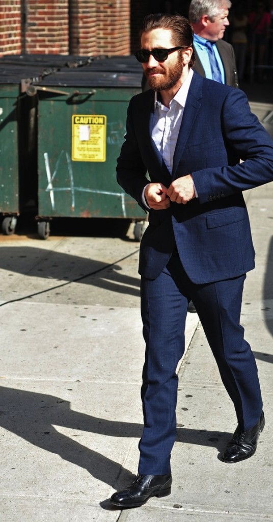 Lehengerlően stílusos a színész ebben a kék öltönyben! A brogue mintás bakancs a szezon egyik alapdarabja, és kiválóan mutatja, az öltöny magas szárú cipővel is működik, sőt, a bakancs az oxford cipő egyik alternatívája is lehet.