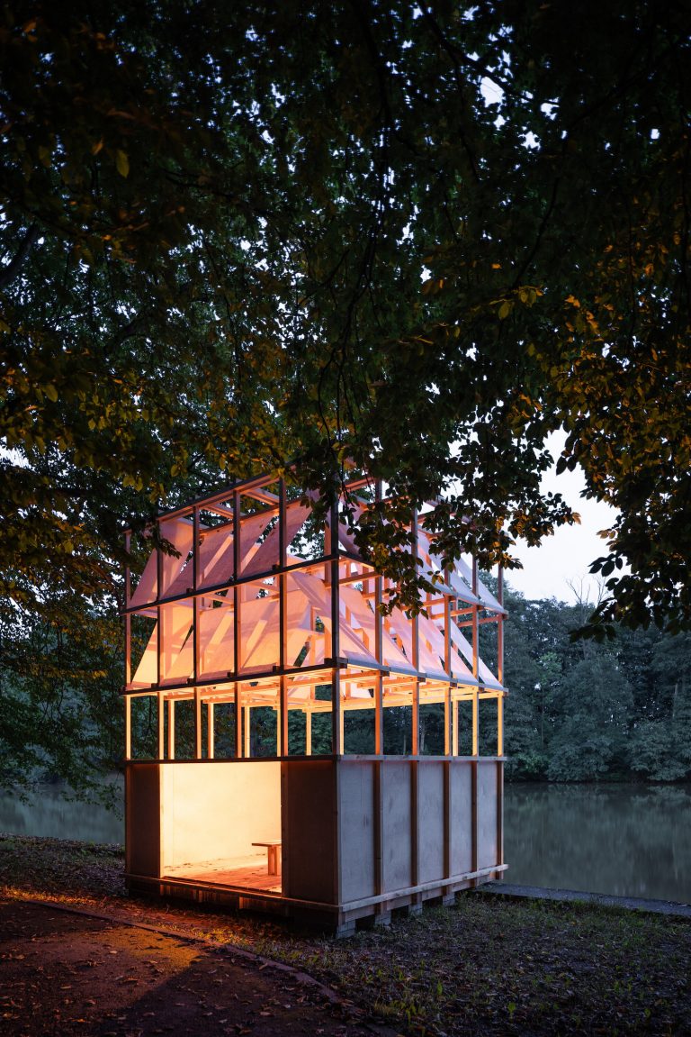 A pavilon alapterülete 3x3 méter, a magassága négy méter, ami egyben a pavilon megengedett legnagyobb magassága is. Lucfenyő padlódeszkákat, nyírfa rétegelt lemezt, a tetőre pedig geotextíliát használtak; a lemezek védelmet nyújtanak a napsütés és eső ellen, ám a vázszerkezet eléggé szellős és nyitott a külvilággal való kapcsolat fenntartásához.