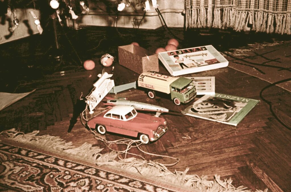 Ajándékok a fa alatt 1966-ban. Elöl a Budapesti Lemezárugyár terméke, de nem valamilyen szocialista autó, hanem egy Packard (Fotó: Fortepan/Beyer Norbert)