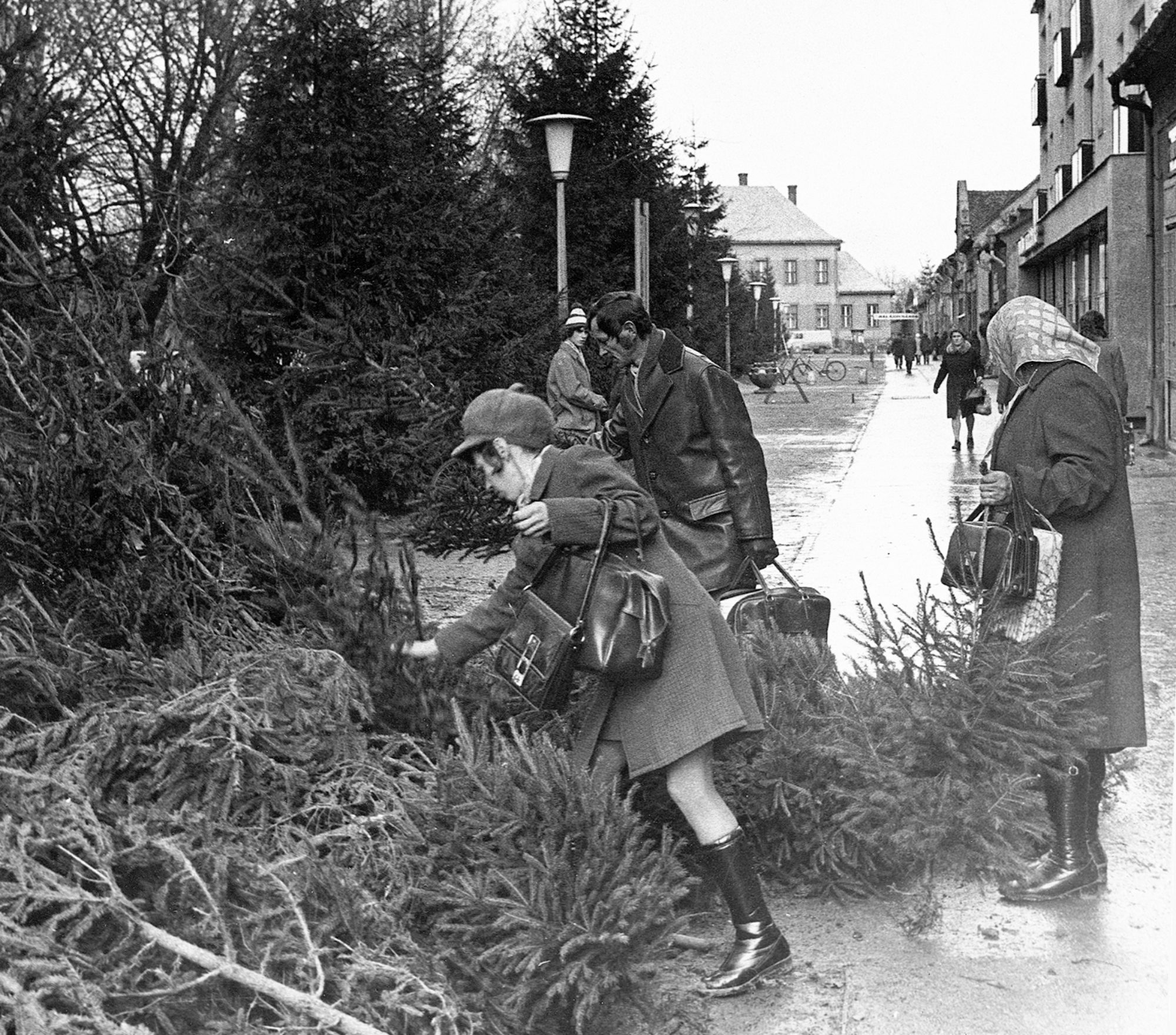 Fenyőárus Dombóváron, a Hunyadi téren 1974-ben (Fotó: Fortepan/Erky-Nagy Tibor)