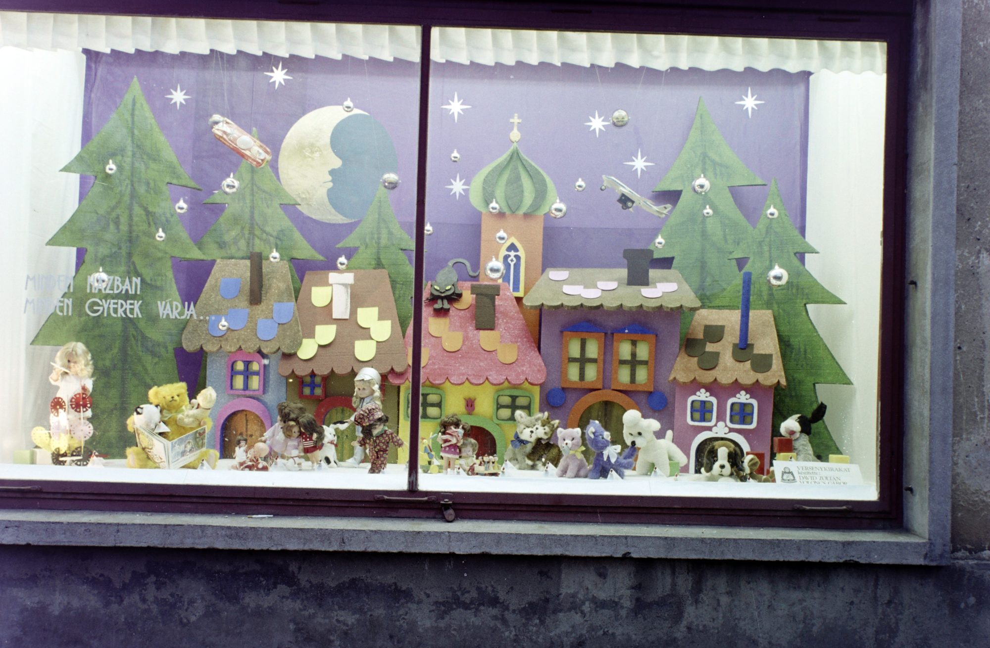 Egy 1980-as kirakat. (Minden házban minden gyerek várja…” (Fotó: Fortepan/Bauer Sándor)