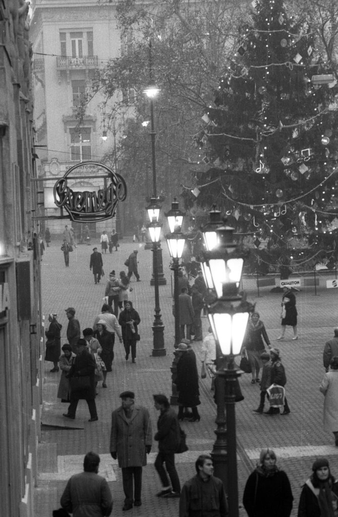Karácsonyfa a pesti belvárosban, a Vörösmarty téren. Távolban az Anker-ház. 1979 (Fotó: Fortepan)