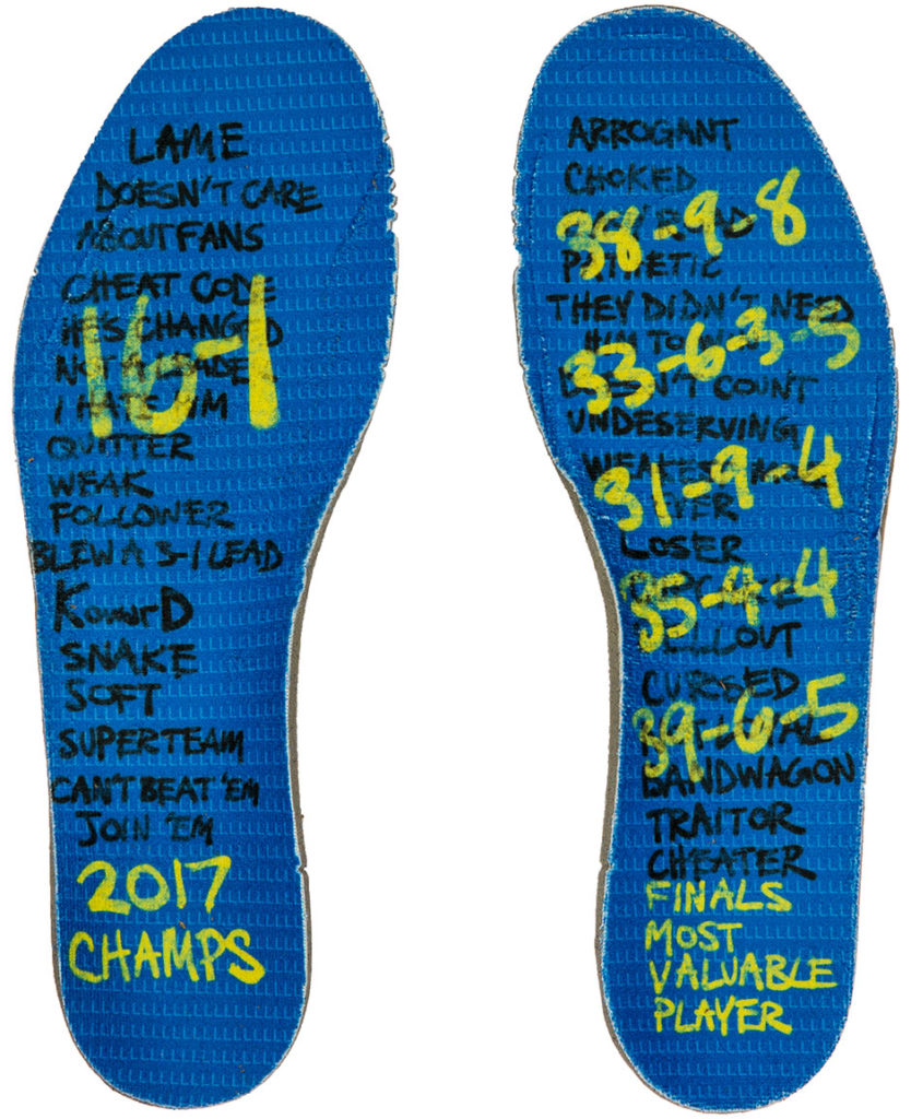 A talpbetéten a kritikusai leginkább kedvelt kifogásai olvashatóak (áruló, arrogáns, gyenge stb.) feketével, sárgával pedig a GSW rájátszásbeli mérlege és Durant statisztikái láthatóak.