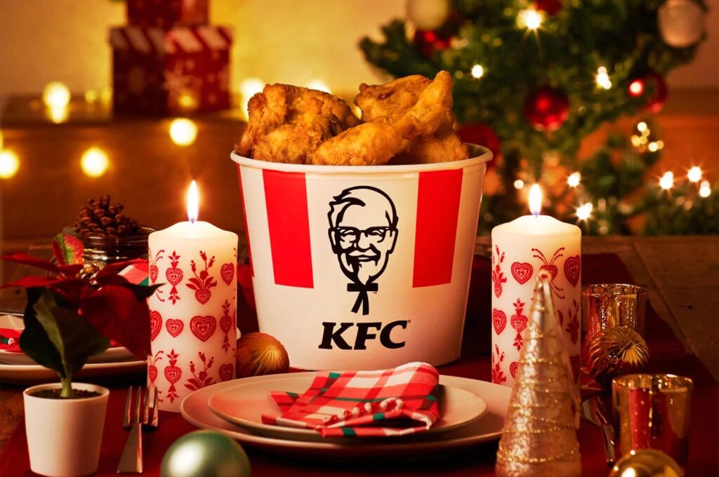 A KFC nem aprózta el a dolgot, speciális menüket hozott létre, amiben a csirkén és salátán kívül torta, de néha praktikus kiegészítők, például tányérok is voltak: kész megoldás a háziasszonyoknak az ünnepi asztalra. Ahhoz, hogy a vizuális élmény is teljes legyen, a bejáratoknál álló Sanders ezredes szobrokat Mikulás-ruhába öltöztették. Mivel a japánok számára a fehér szakállas, pocakos öregúr figurája amúgy is passzolt a Mikuláshoz, az akció tökéletesen sikerült.