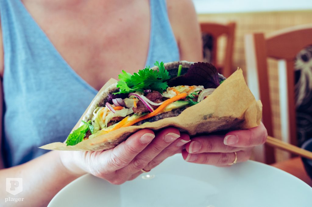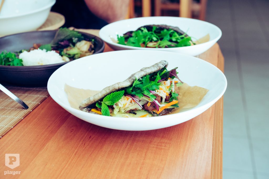 Na, de ezt a klasszik fogást is tovább álmodták, mivel már a bao buci sem fehéren érkezik tányérunkra, hanem lilán vagy szürkén, és ezzel is azt sejteti, hogy itt valami csavar van a történetben. Fancy! Belülre pedig csípős majonéz és koriander pesztó került, na meg egy halom jobbnál jobb zöldfűszer, és nem csak korianderzöld!