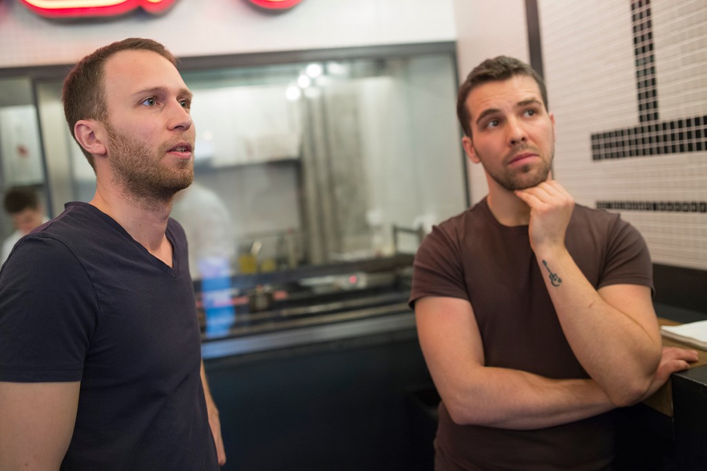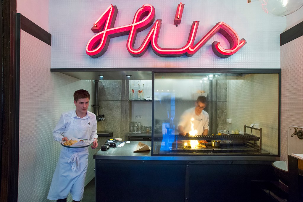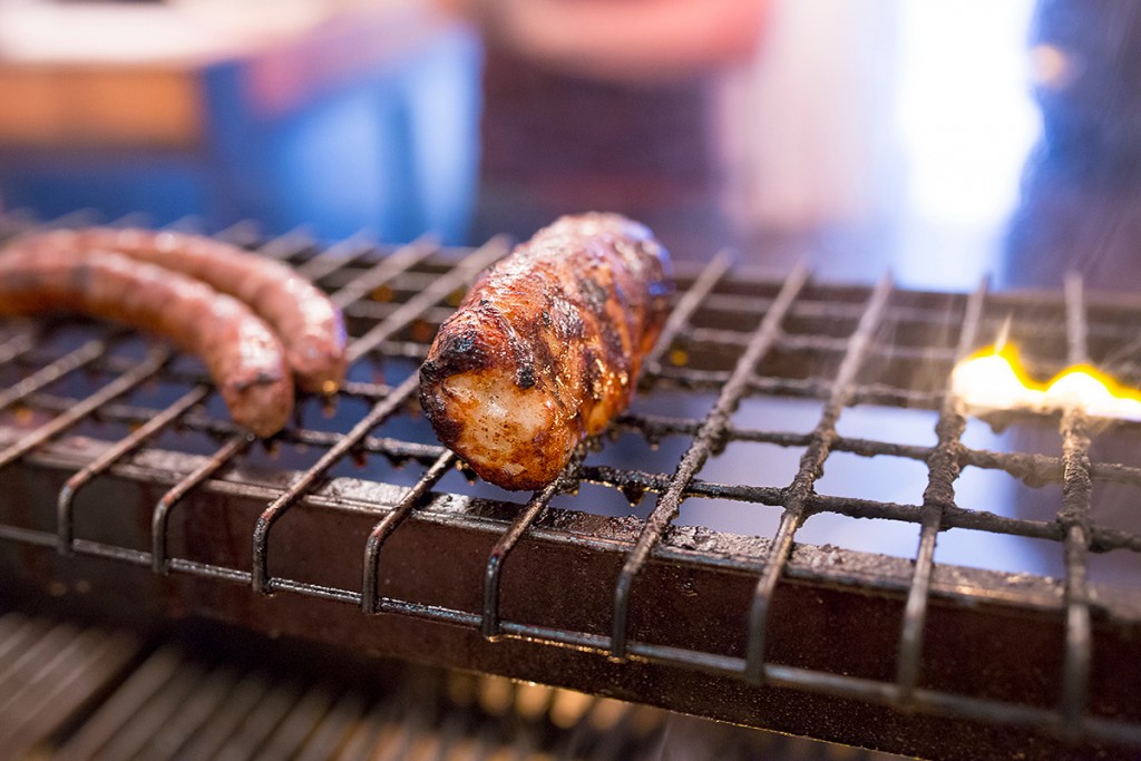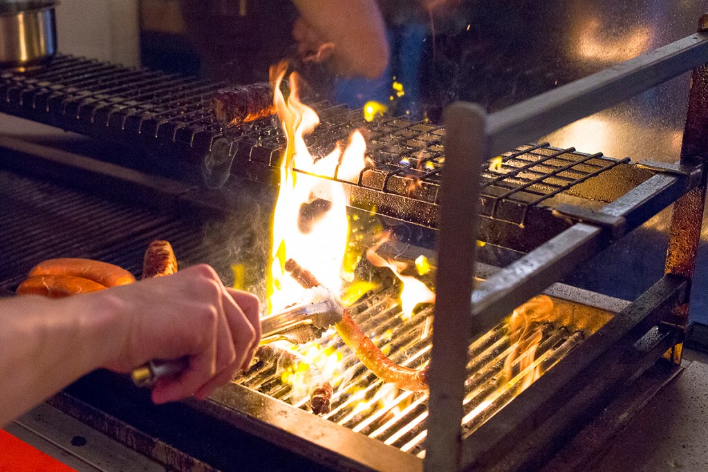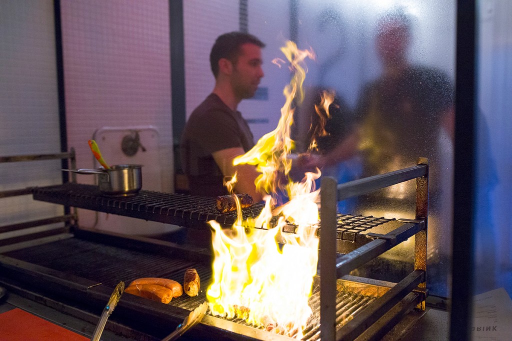 A helyszínen Sajben Csaba kalauzolt körbe minket, aki a Benkő Zoltán nevéhez köthető szomszédos Innioban dolgozott, majd Kurucz Attila társával kigondolták a kortárs kolbászozó koncepcióját, majd meg is valósították azt. A Faszaládé beltere nem nagy, kétoldalán kaptak helyet az asztalok, viszont székeket ne is keressünk, a klasszikus talponálló feeling vár itt mindenkire. Az ajtóval szemben pedig a látványpultban sülnek a kolbászok, egészen konkrétan nyílt lángon, faszénen (újabb poénra lenne lehetőség, de nem élek vele).