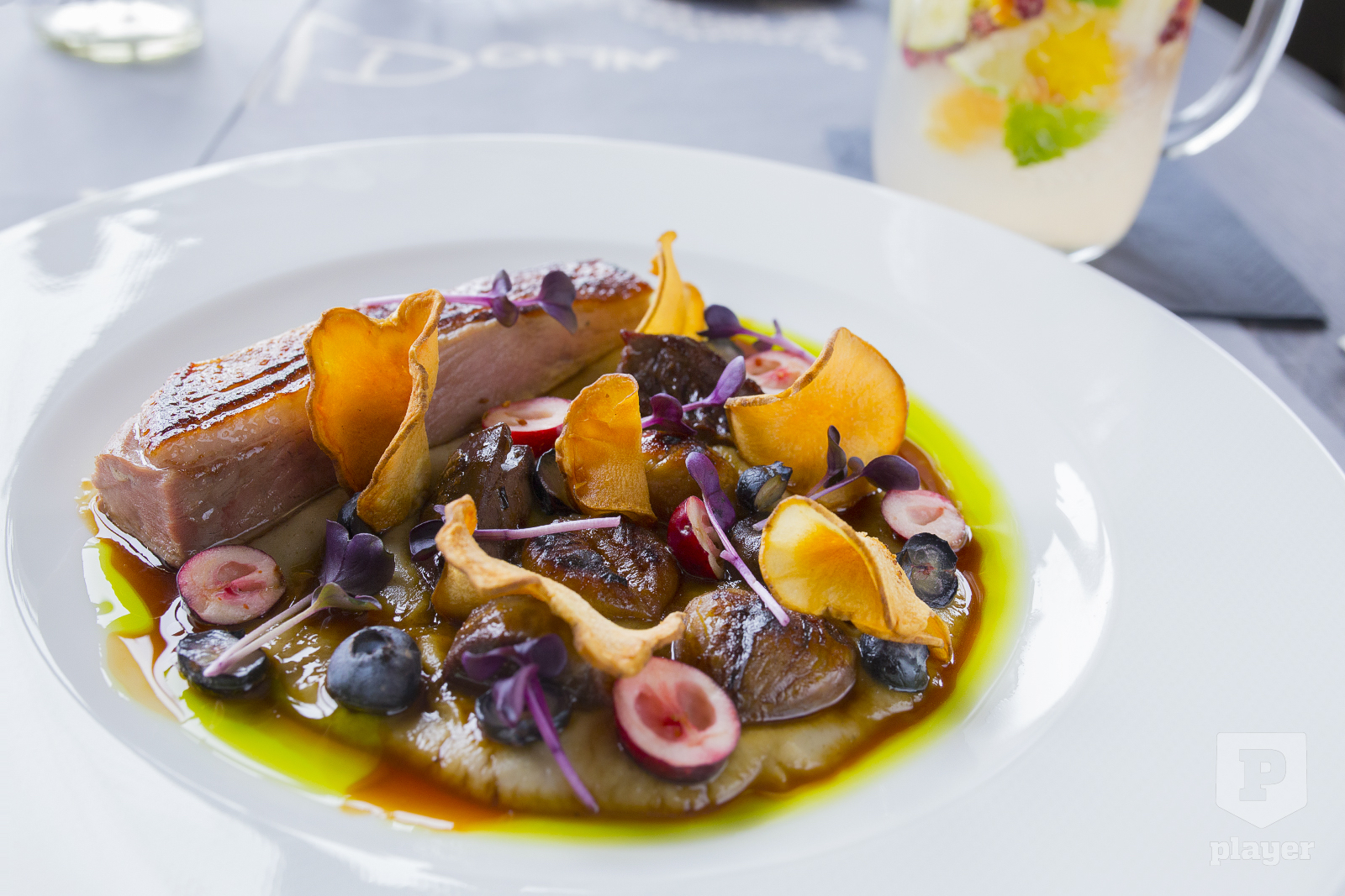 Nagyon őszi-téli hangulatú volt és jól példázta a célként kitűzött ázsiai fúziós irányvonalat az ötféle gombával körített füstölt kacsamáj. Ez a szájban olvadós finomság bizonyára a tavaszi étlap érkezésével el fog tűnni, de legalábbis át fog alakulni. A mellé készült jus mögötti know how: a laskagombát megpirítják vajon, újhagymával befrissítik, és a végén egy redukált barnasörös jus-vel és marhahús jus-vel visszaforralják.