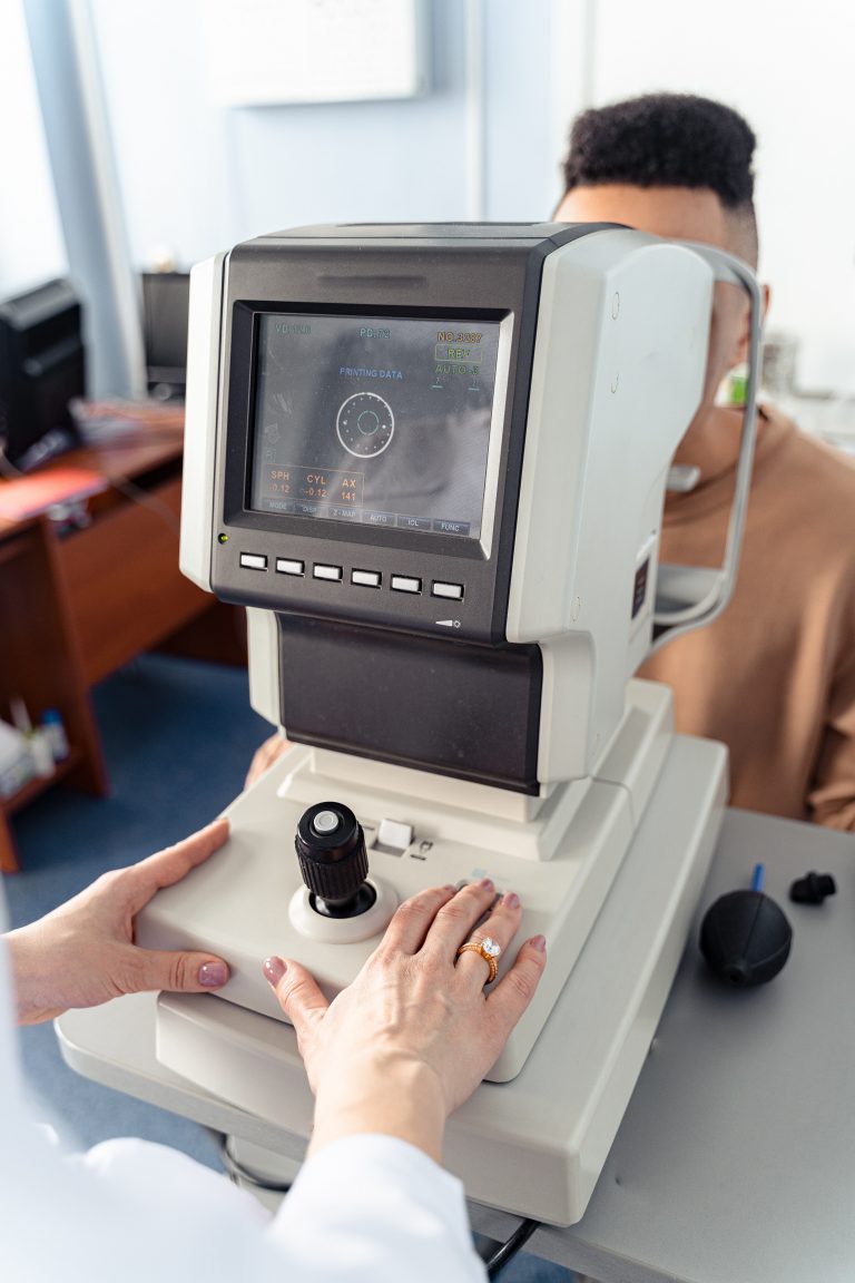 - Az első rész egy objektív számítógépes vizsgálat, ahol a géphez támasztott állunkkal egy távoli képet nézve a számítógép beméri, milyen távoli dioptriára lehet szükségünk, de ez az adat még ellenőrzésre szorul.