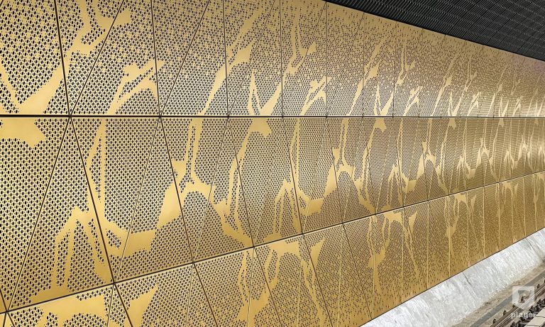 A Ferenciek tere megállójának színvilága is harmonikus lett, a visszafogott barna és a ragyogó arany kontrasztja határozza meg. A peronnal szembeni kábeltakaróra madármotívumok kerültek, ezek