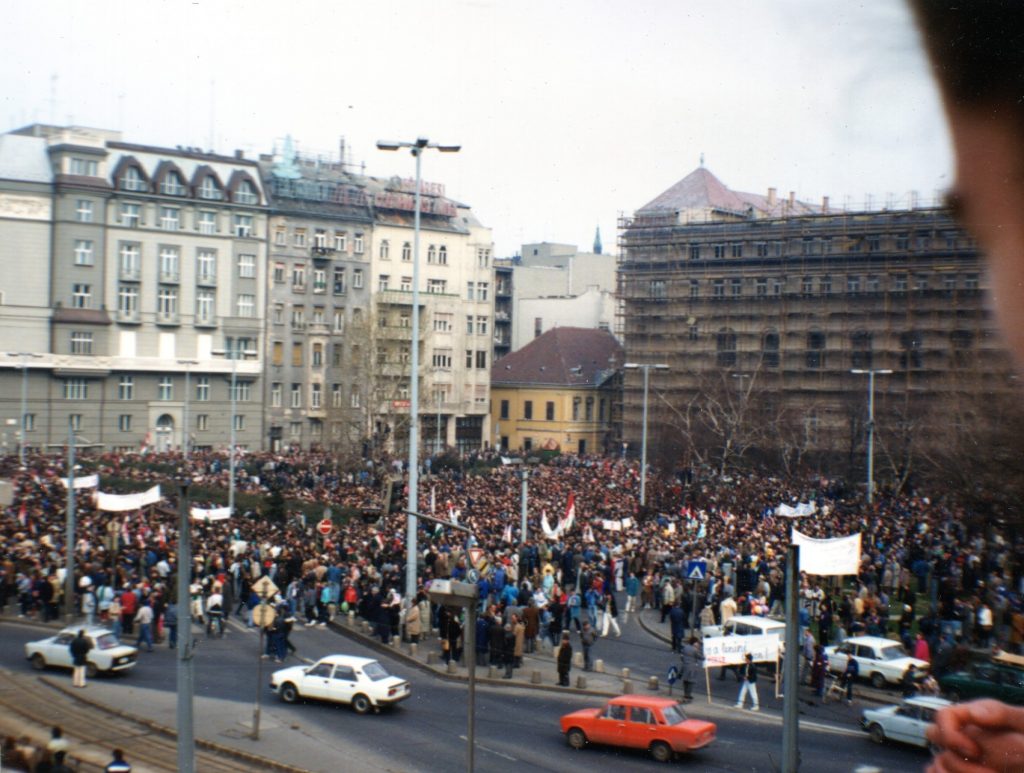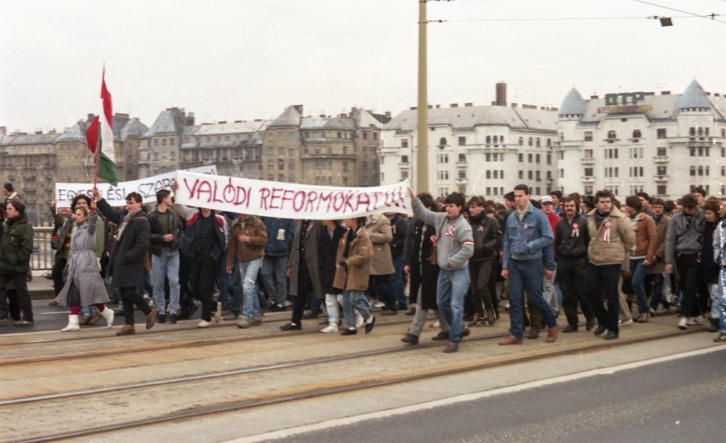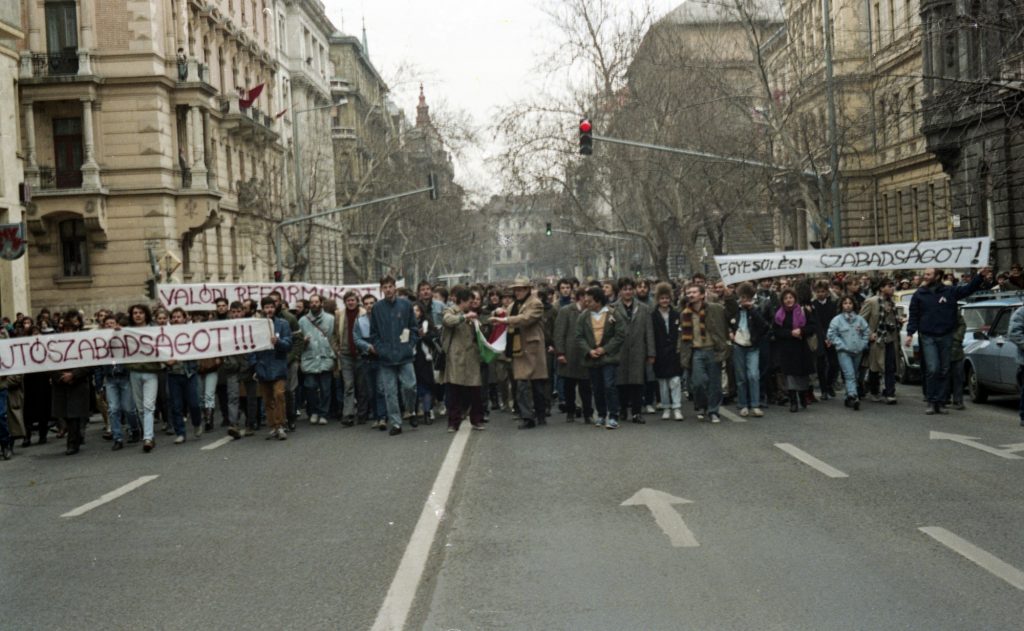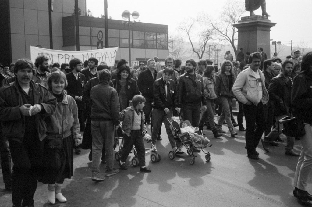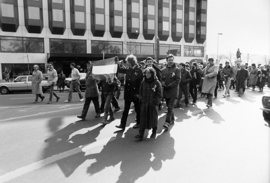 1987, Széchenyi István (Roosevelt) tér, háttérben az Eötvös-szobor. A március 15-i megemlékezés és békés tüntetés résztvevői vonulnak a Szabadság tér felé (Fotó: Fortepan/Hegedűs Judit)