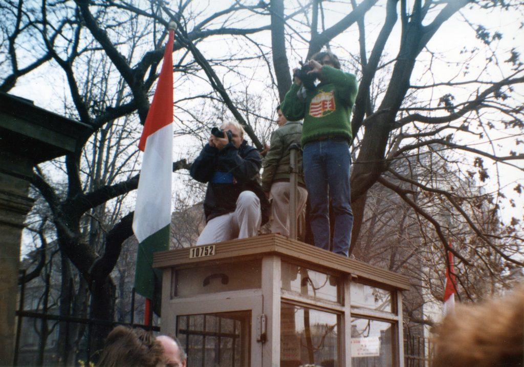 1989, Múzeum körút a Nemzeti Múzeum bejáratától a Múzeum utca felé nézve. A fotósok a múzeumkerti március 15-i ünnepség résztvevőit fényképezik a telefonfülke tetejéről (Fotó: Fortepan/Marics Zoltán)