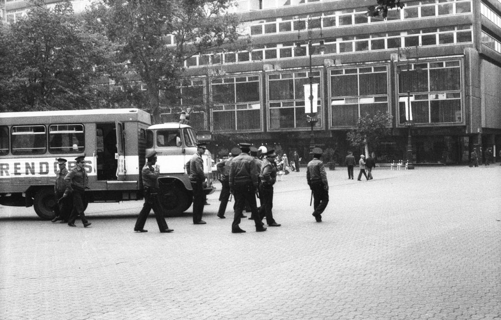 1989, rendőrök március 15-én a budapesti Vörösmarty téren (Fotó: Fortepan/Philipp Tibor)