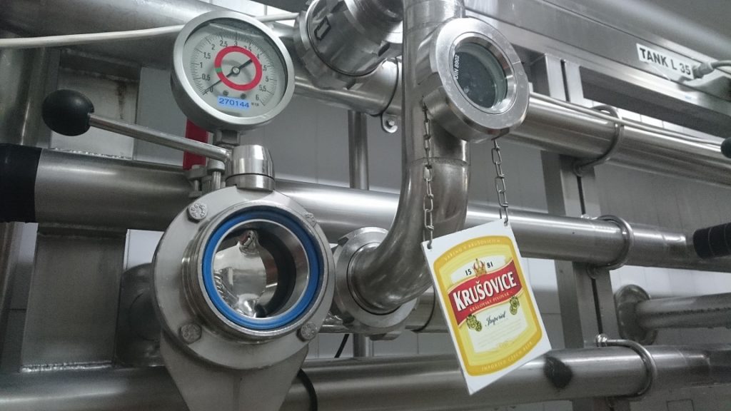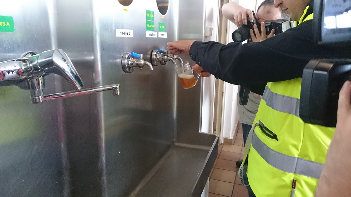 A különböző stádiumok termékeit meg is tudtuk ízlelni. A felhasznált maláta olyan kellemes ízű volt, hogy simán el tudnék ropogtatni belőle egy nagyobb zacskóval meccsnézés közben, ha szeretném a focit és a foci közben szotyizást, de mivel egyiket sem, ezért maradjunk annyiban, hogy a Krušovicéhez felhasznált szemes maláta igencsak finom dolog. A meleg sörlé aztán leginkább valamilyen édes üdítőre hasonlított. Ebben még nincs semmi alkohol, ellenben cukor már dögivel, így egy kellemes forró ital benyomását keltette. A legjobb persze az volt, amikor a fejtés előtt a rozsdamentes csövekben vándorló sört úgy folyatták nekünk pohárba, mintha csak otthon kinyitnád a vízcsapot és töltenél magadnak egy korsónyi zuglói vizet.