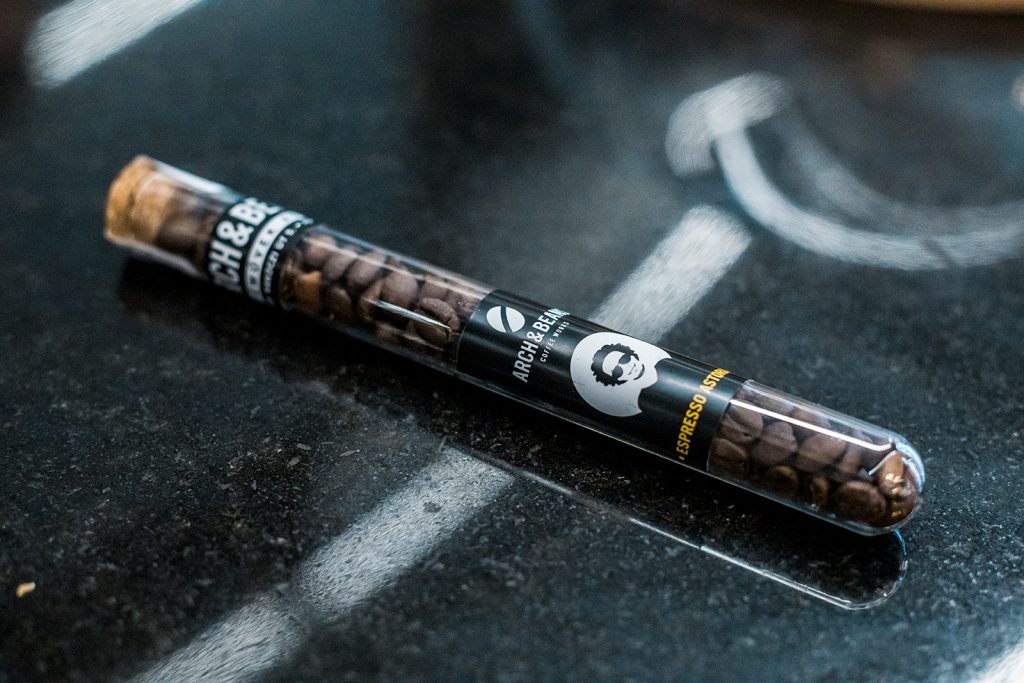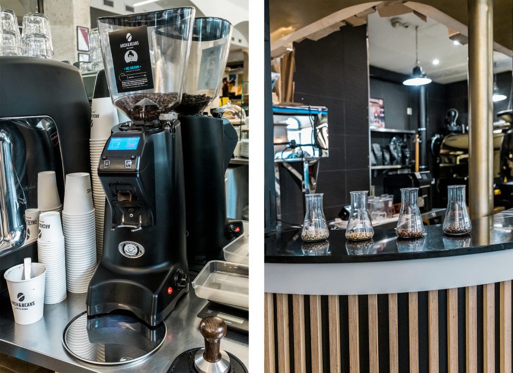 Lóránth Zoltán közérthető kávékat szeretne készíteni az Arch and Beansben, úgyhogy a Rákóczi út 5-ös szám aligha lesz a kávénördök zarándokhelye, sokkal inkább a tejeskávésok és diákok gyülekezőpontja lesz, amivel nincs is semmi baj. A kávékat a hely saját pörkölőjében készítik egy méretes Probaton, meg is lehet nézni, ahogy az egyik sarokban gyülekező, zöldkávét tartalmazó kávés zsákokat is. Kétféle kávé közül választhatunk: van egy sötétebb pörkölésű Astoria Espresso Blend és egy világosabb, single origin, aminek a fajtája folyamatosan változik. A kávékat egy félig kolumbiai, félig galíciai kereskedőtől szerzik be, van közöttük brazil, kenyai, és hondurasi fajta is.