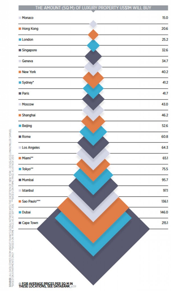 Valahol egy garzonnyit se – ez derül ki a Knight Frank, a világ vezető független ingatlan-tanácsadó cégének felméréséből. Az sejthető, hogy Monaco drága, de hogy ennyire, azért az meglepő, ahogy például az is, hogy Dubaj a luxuslakások árát nézve még sehol nincs a kicsit nagyobb múltú metropolisokhoz képest. (Az infografikán feltüntetett számok jelzik, hány négyzetméternyi luxuslakást lehet venni az adott városban egymillió dollárból.)