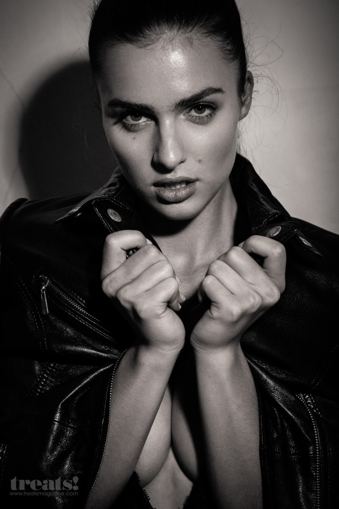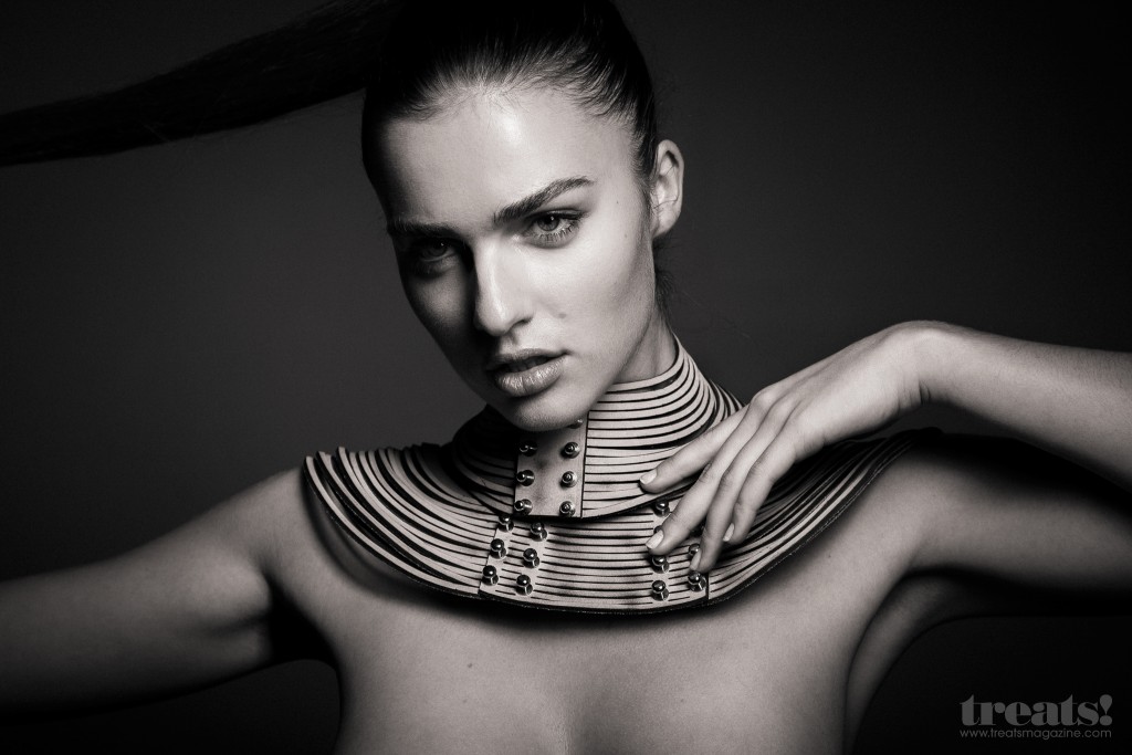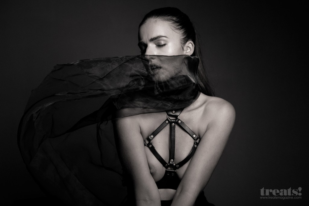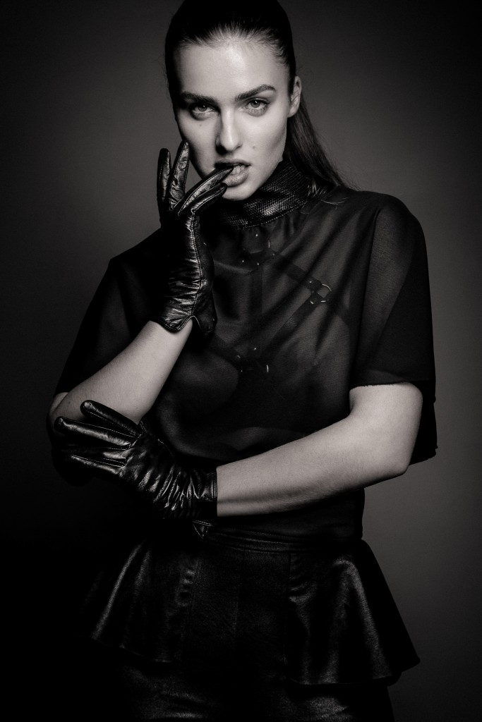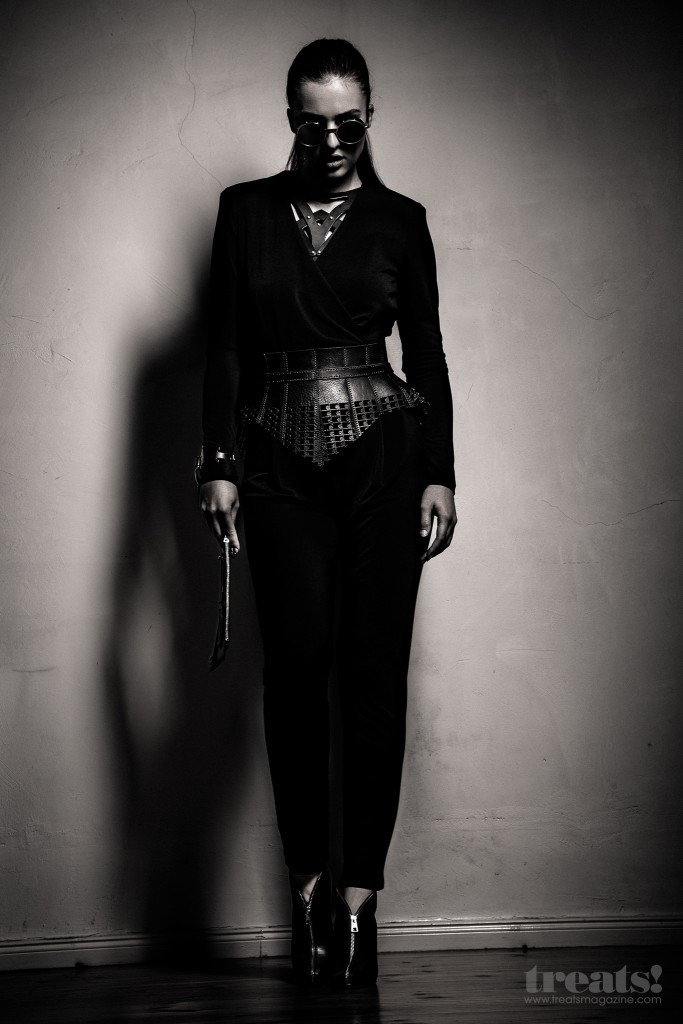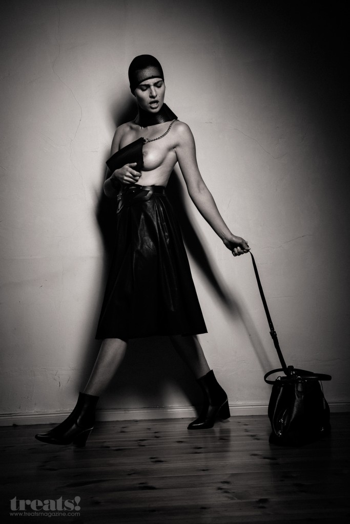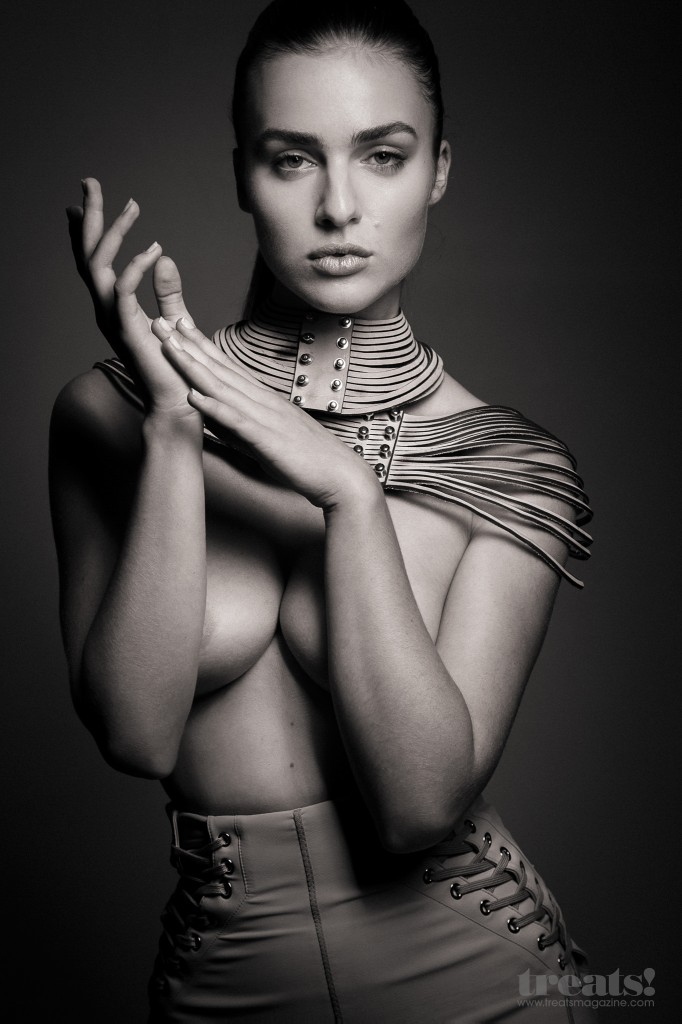 Melanie Paul modell fekete-fehérben, szigorú öltözetben, fantasztikus mellekkel szítja a vágyakat.
