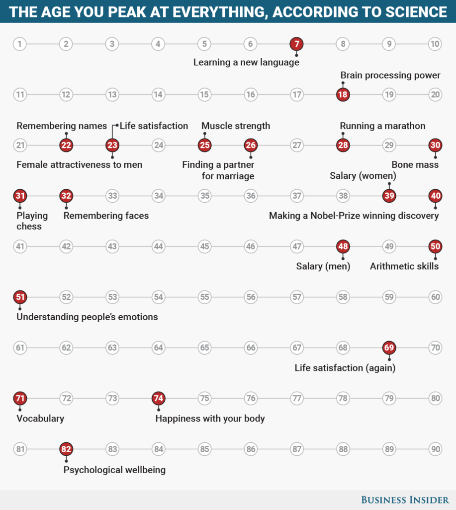 A Business Insider által készített ábra természetesen nem hasraütésszerűen készült, hanem különböző kutatások, tanulmányok alapján. A jó hír az, hogy nemcsak 20-30 évesen érhetünk a csúcsra mindenben, hanem 60 és 80 felett is rátalálhatunk a boldogságra, felfedezhetjük erősségeinket.