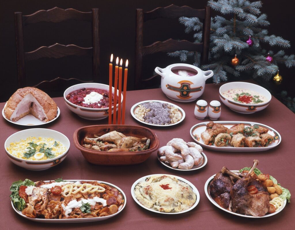 Köretfronton gyakori a gesztenye, az aszalt szilva, a franciasaláta és a krumplisaláta. Úgy tűnik, a lazac lassan kiszorítja a pontyot a menüből.