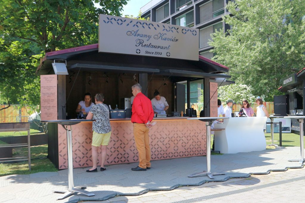 A szervezők meginvitáltak bennünket a budavári Arany Kaviár és az esztergomi 42 Restaurant & Bar standjához egy kóstolóra is a fesztivál első napjára. A sorszámozott standok között a könnyen átlátható rendezvénytérkép segítségével pillanatok alatt meg is találtam a rendszerváltással egyidős, idén 32 éves Arany Kaviár elegáns, rozéarany borítású standját.