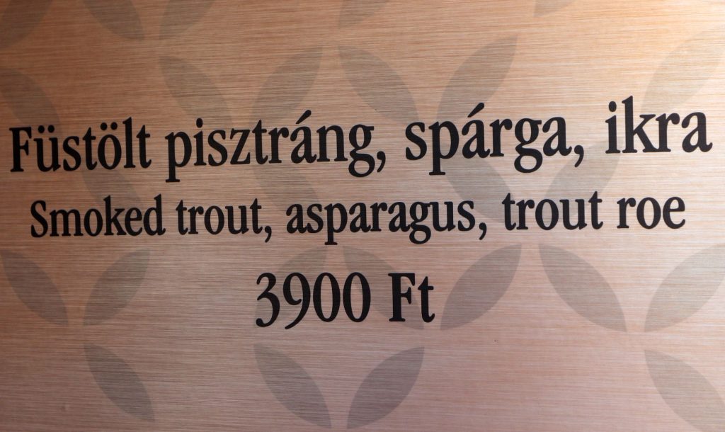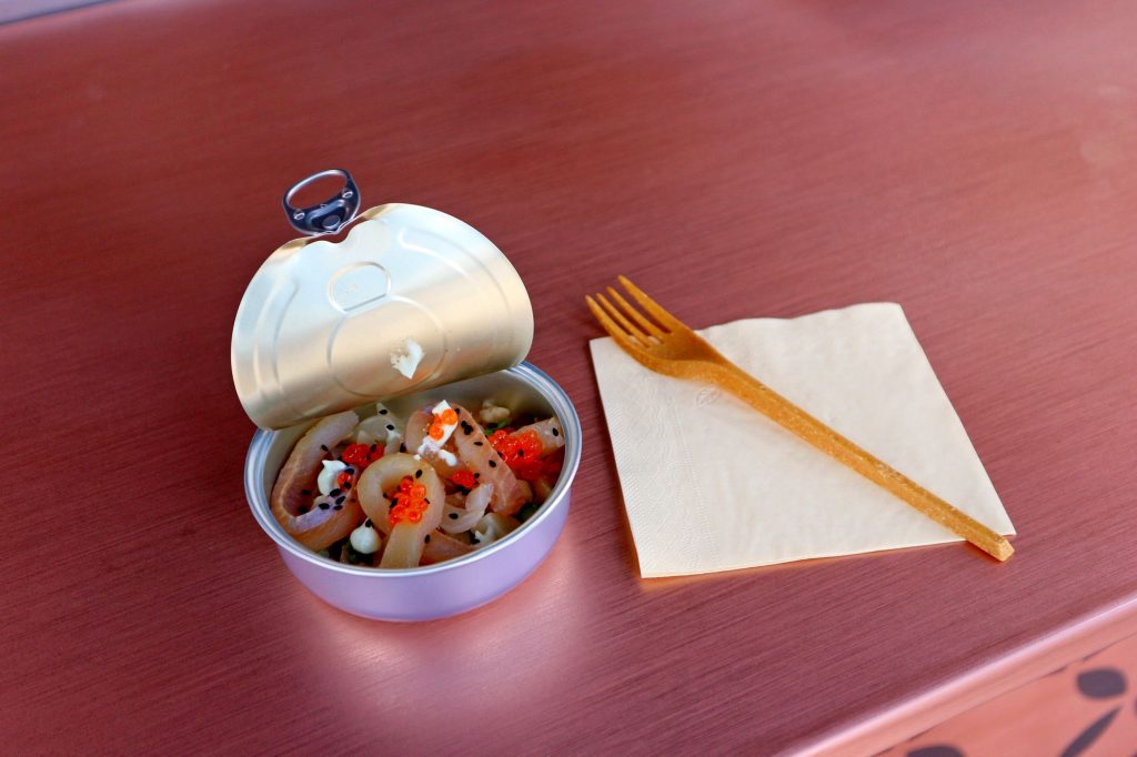 A különleges halakra, tengeri egzotikumokra és persze mindenféle fajta kaviárokra, no meg a hozzájuk passzoló, nem kevésbé érdekes (és drága) borokra-pezsgőkre specializálódott étterem séfje mellett kutatás-fejlesztési menedzser (!) is dolgozik. A stábnak sikerült is alaposan meglepnie azzal, hogy egy szabályosan leforrasztott konzervdobozban kaptam meg a „Füstölt pisztráng, spárga, ikra” nevű fogást. A doboz kinyitása után viszont már nem volt több meglepetés. Tényleg füstölt pisztráng, spárga és ikra volt benne, savanykás hagymás-zöldséges kísérettel.