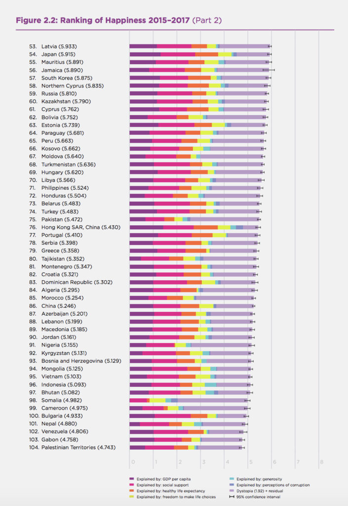 Az ENSZ elkészítette a Boldogság-jelentését, aminek összeállítása során többek között olyan szempontokat vett figyelembe, mint az egy főre jutó GDP, az egészségi állapot, a várható átlagos élettartam, a szociális ellátás, a kormányba vetett bizalom és a korrupció érezhetősége, de volt még egy csomó egyéb tényező is.