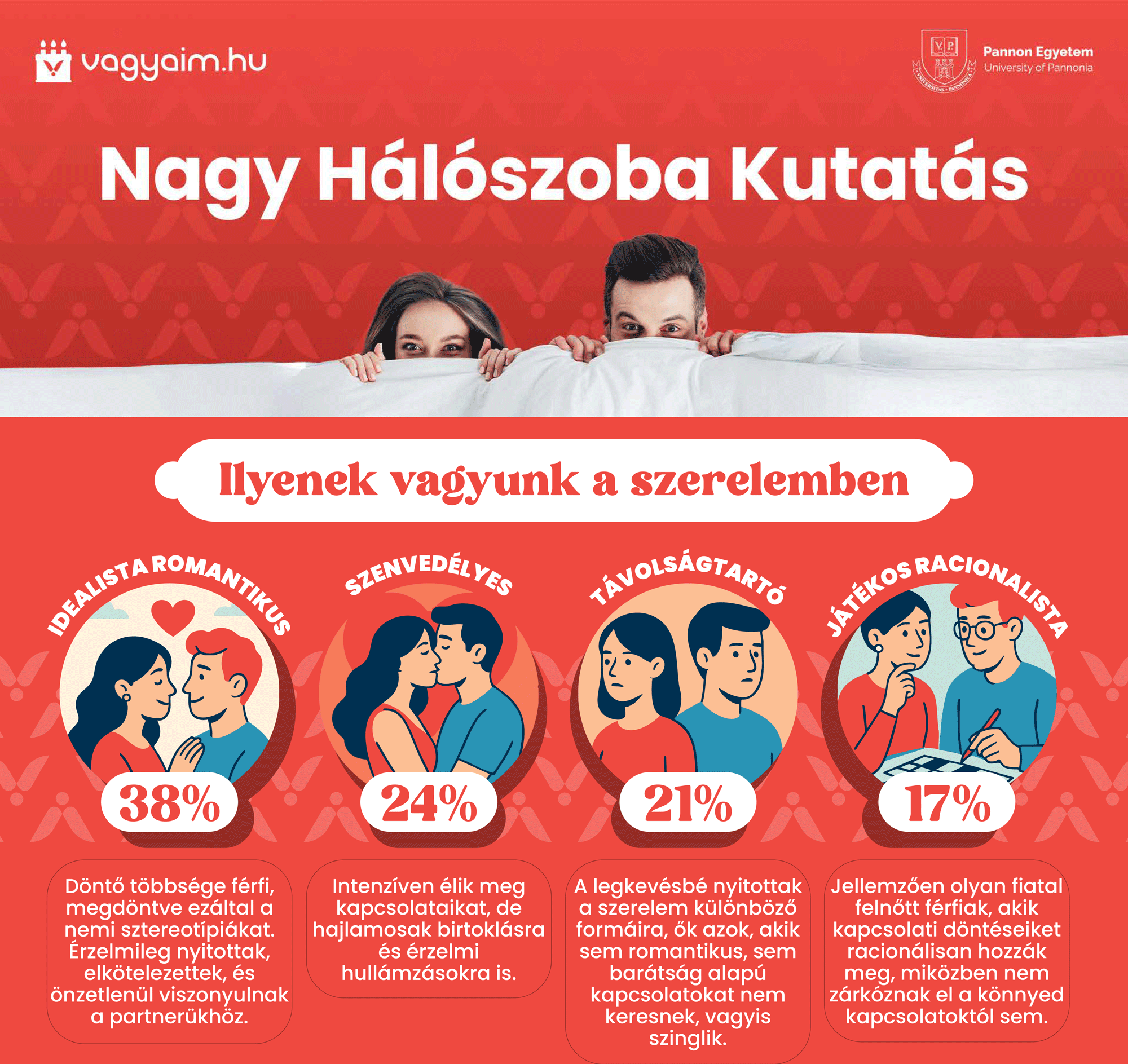 A Pannon Egyetem Gazdaságtudományi Kara elfogadta a Vágyaim.hu felkérését egy olyan komplex, több mint 2000 fős kutatás elvégzésére, amely feltérképezi a magyar lakosság szerelmi-párkapcsolati életének minőségét, szexuális kreativitási-elégedettségi profilját. Az átfogó kutatás megállapításai új támpontokat adhatnak az edukációs, a párterápiás és a szexuális egészséget fejlesztő programokhoz, a magyarok boldogságérzetének fokozásához, a kiegyensúlyozottabb és tartósabb párkapcsolatok fenntartásához, amelyek együttesen segíthetik a kapcsolati élmény tudatosabb megélését, valamint a sikeresebb családtervezést is. Az egyetem a kutatást az idén 18 éves Vágyaim.hu megbízásából készítette: