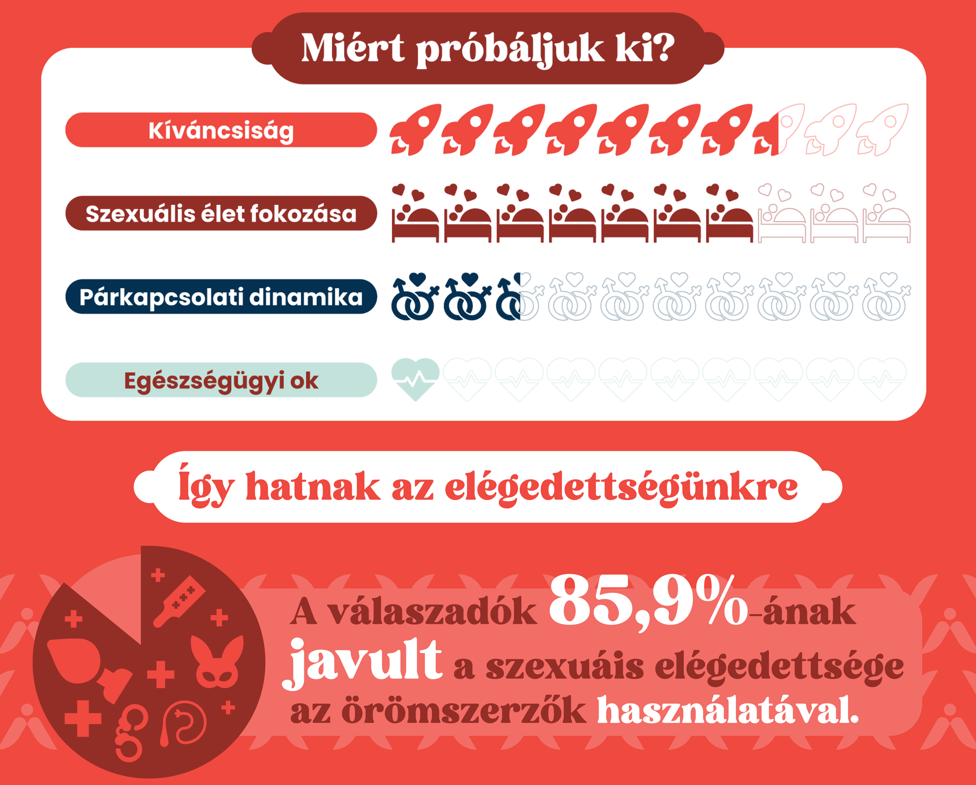 Az örömszerző eszközök elutasítottsága alacsony (19%), aminek okai leggyakrabban információhiányból, zavarérzetből vagy partneri ellenállásból fakadnak. A nem használók között többen a pénzhiányt említik mint gátló tényezőt – tehát a gazdasági hozzáférés is fontos kérdés. A kutatás kimutatott generációs különbségekre is: a Z generáció tagjai (18–29 évesek) nyitottak az örömszerző eszközökre, de még nem váltak rendszeres használókká, ami arra világít rá, hogy ebben az életszakaszban az állandó párkeresés van inkább fókuszban, semmint a kapcsolat intimitásának elmélyítése.