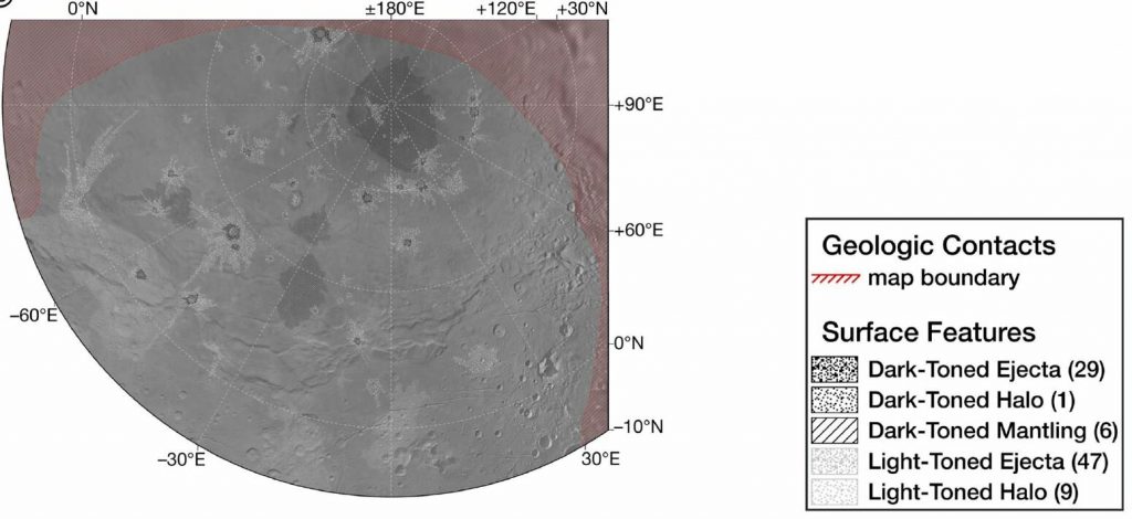 Ezen a területen a tudósok 16 különböző típusú geológiai egységet, vagyis hasonló típusú területet azonosítottak, köztük tíz kilométer magas szirtekkel, több mint ezer árokkal és más hosszúkás, lineáris képződménnyel.