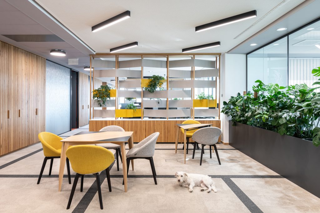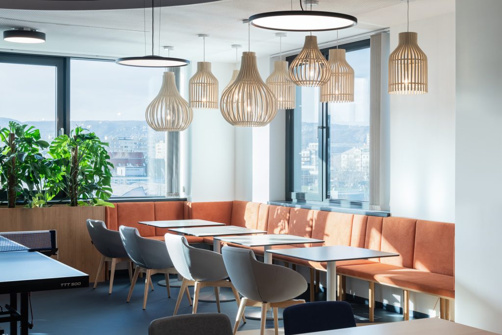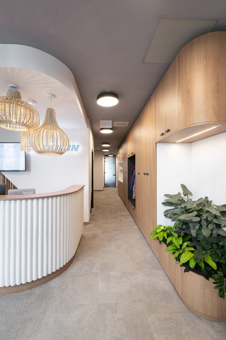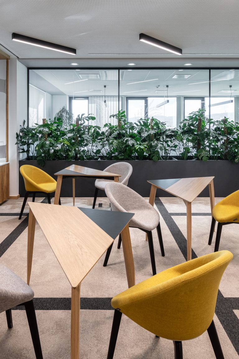 Terveztek hát egy silent roomot, de az open office két oldalánál van két-két kisebb és nagyobb tárgyaló, a recepció mögött egy interjúszoba, plusz a kettéosztható nagy tárgyaló. Még touch down területek is vannak, ahol kötetlenebbül lehet dolgozni, ha például valaki csak rövidebb időre megy be egy terepmunkáról, de a változatosságot fokozzák az eltérő méretű közösségi terek is, amelyek hangsúlyosságát mi sem jelzi jobban, minthogy a 750 m²-es irodából kerek százat az informális beszélgetések császára, a konyha foglal el.