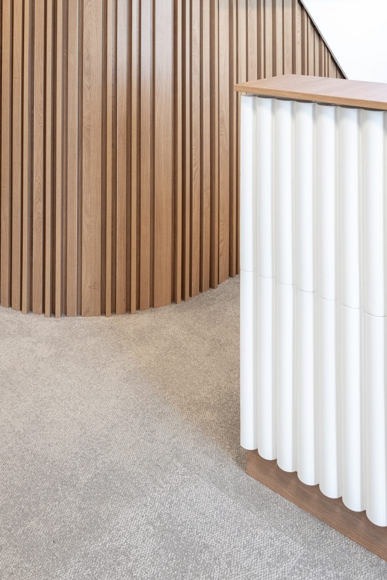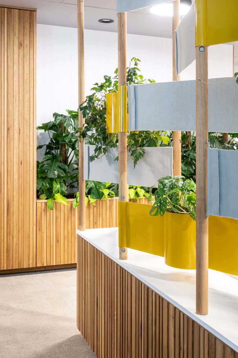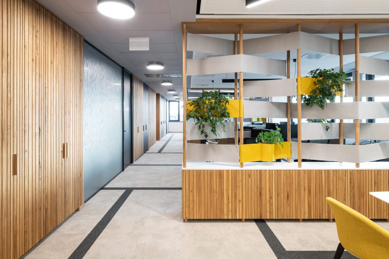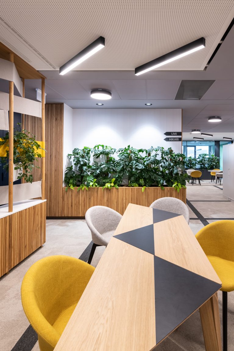 Bár az open office nemzetközi policy a japán cégnél, a tervezők igyekeztek megtörni ennek monotonitását, térelválasztókkal, akusztikai elemekkel kisebb öblökre osztva fel az irodateret. Ez volt a legnagyobb kihívás, amit jól fogadott a megrendelő is, elvégre – ahogy Katalin mondta –