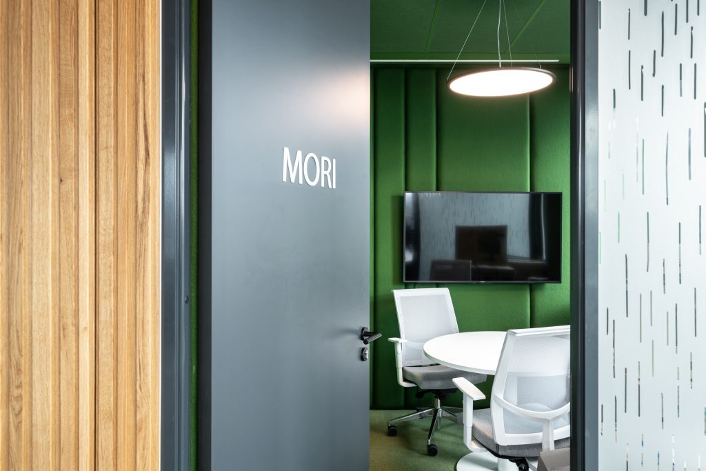 A színes tárgyalóknak japán neveik vannak; először a színek voltak meg, hozzájuk kerestek japán megfelelőt. Így lett mori (erdő), umi (tenger) és hikari (fény) – az utóbbi egy Shinkansen típus is, ami „lassabb a Nozominál, de gyorsabb a Kodamánál”, tudtuk meg Fogl Krisztinától, a cég marketingesétől. Külön kategória a momiji (japán juhar) szoba, ami az ősz szimbóluma Japánban: a levelei olyankor gyönyörű színekben pompáznak, fokozatosan alakulnak zöldről sárgásra, narancssárgásra, pirosasra, végül mély bordóra. Az őszi momiji ugyanolyan ünnepi, mint a tavaszi cseresznyevirágzás, a sakura.