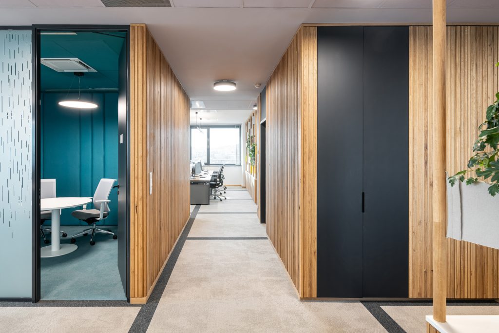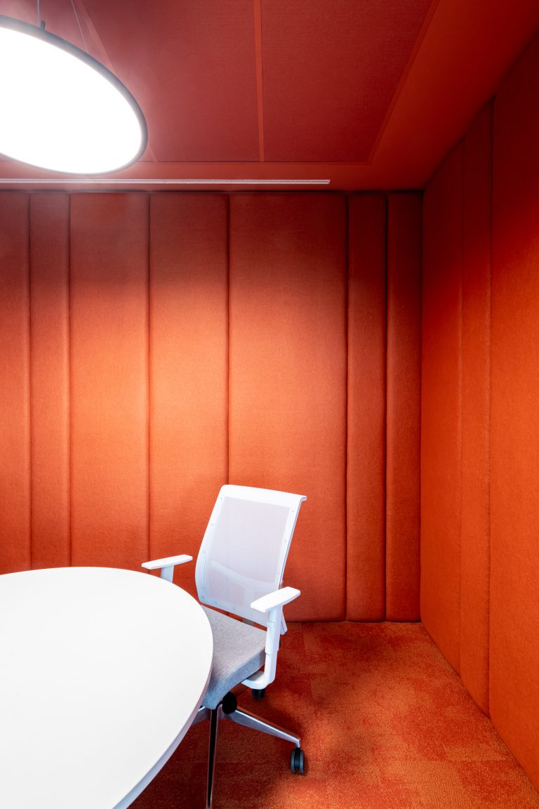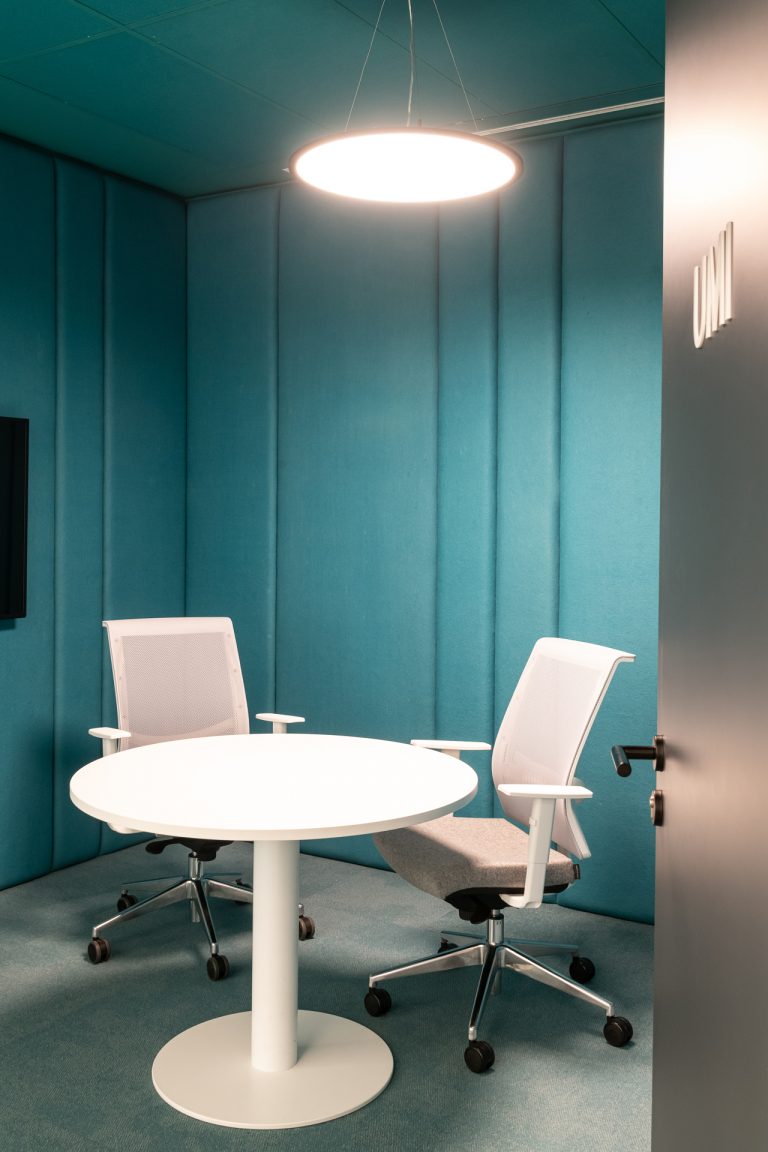 Az irodát már a covid idején kezdték tervezni, és a Nanavízió remekül ráérzett arra, hogy „sok tárgyalóra és közösségi térre lesz majd szükség”, ezért például videokonferenciára alkalmas tárgyalókat terveztek. Katalin személyes sikere az egyszínűre festett kicsi, nyolc négyzetméteres meeting roomok népszerűsége: