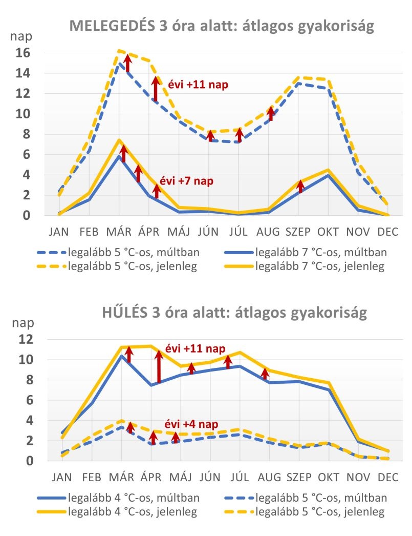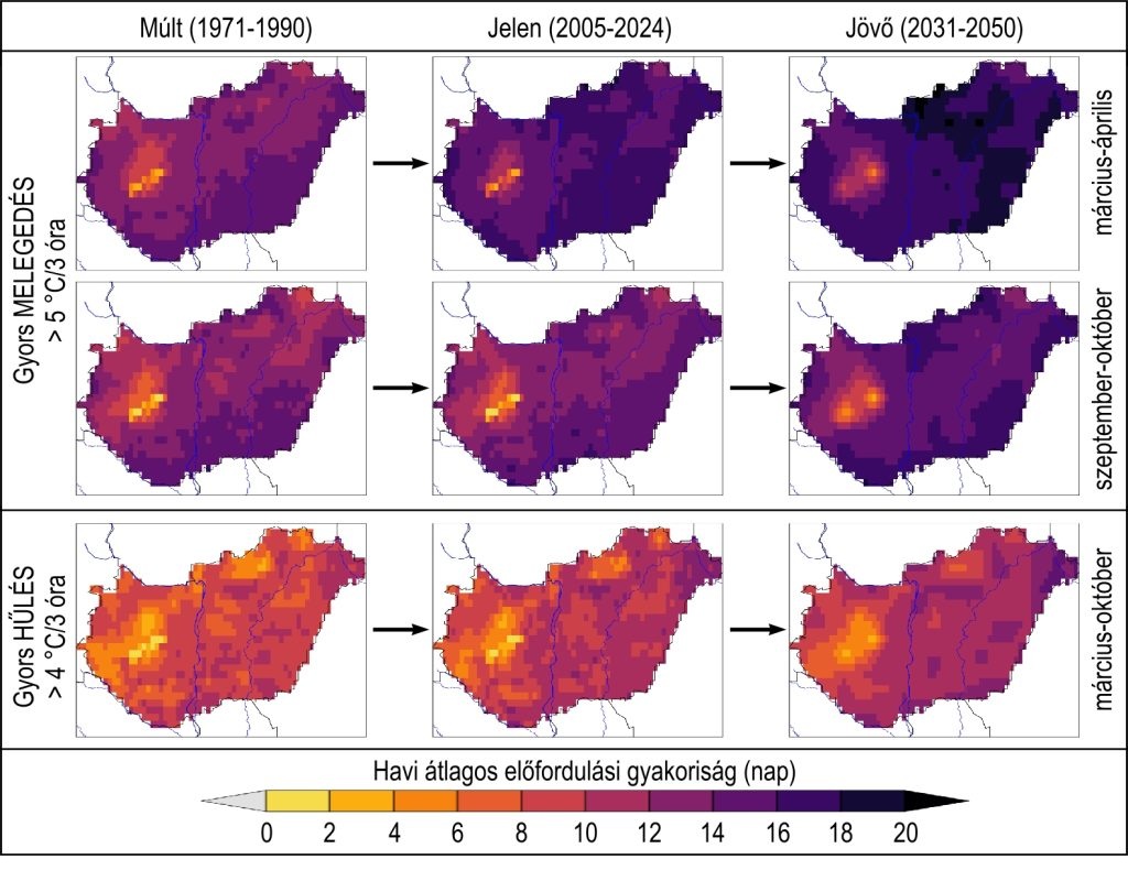 A kutatók megvizsgálták, mire számíthatunk a közeli jövőben, ha az üvegházhatású gázok jelenlegi kibocsátási trendje 2050-ig folytatódik. Eredményeik azt mutatják, hogy a tavaszi vagy őszi gyors melegedések száma elsősorban a Dunakanyar–Budapest–Tisza-tó térségében nő, ahol a sűrűn lakott övezetek és a turizmus együttese miatt fokozott stresszterhelésre számíthatunk. A gyors hűlések gyakorisága várhatóan szintén emelkedik Budapest térségében, így a főváros különösen kitett lesz ezeknek a változásoknak, de az Alföldön is jelentős növekedés lehet.