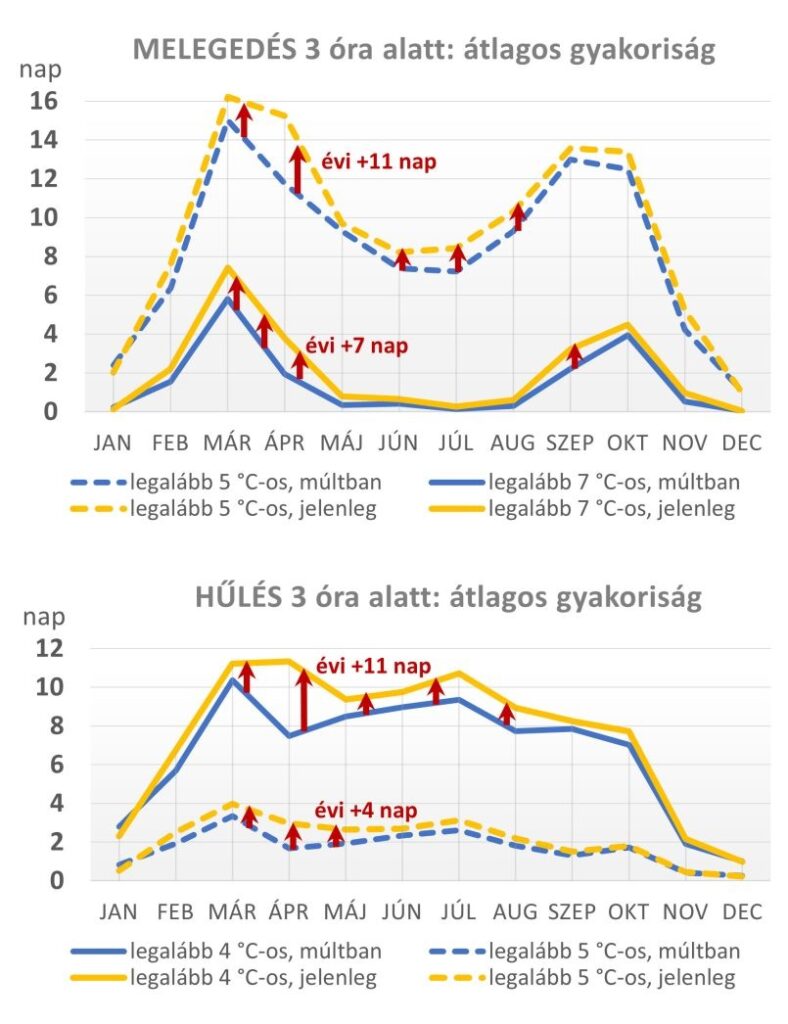 Szabó Péter és Pongrácz Rita olyan gyors, három órán belüli melegedéseket és hűléseket vizsgált, ahol a hőmérsékletváltozás eléri az 5–7, illetve 4–5°C-ot. Eredményeikből az látszik, hogy az utóbbi ötven évben a gyors melegedések és a gyors hűlések gyakorisága jelentősen nőtt, különösképp az eleve szeszélyes április vált ilyen szempontból még szélsőségesebbé.