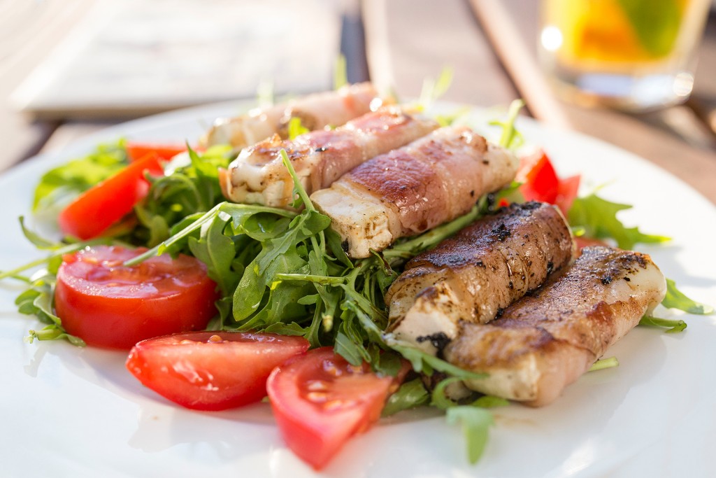 Persze az is egy naív elgondolás volt, hogy a palacsinta a desszert, mivel ezek után vettük észre a "Baconbe göngyölt camambert sajt" nevezetű tételt (1200 Ft), én meg a földről szuszogva vetettem oda, hogy olyan nincs, hogy én azt ne kóstoljam meg. Mint kicsit később kiderült, ez egy tökéletes döntés volt, mivel a vékony sajtcsíkok zsíros-ropogós egyvelege a baconnel együtt egyszerűen olyan duót alkotott, amelyet alanyi jogon kötelezővé tennék minden Városligetbe látogatónak. A teljességhez hozzátartozik, hogy ez rukkolás paradicsomágyon érkezik, szóval a vitamin is benne van bőségesen, csak ha aggódtatok volna.