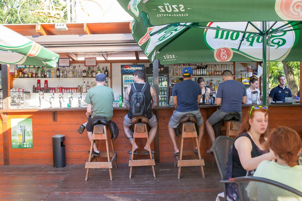 Egy hétköznap délután jártunk ott, de körbenézve ezt teljes mértékben mi is alá tudtuk támasztani: az egyik sarokban angol turisták üldögéltek egy pint (bocsánat, korsó!) felett, távolból fürdőruhás külföldi lányok érkeznek a fürdő felől, egy csatolt egységként jelen lévő igen bundás kutya éppen egy tál vizet kap a pultostól, és ráadásul a végére, mint egy jobb amerikai filmben, egy kisgyermek is befut a napi gyümölcsös limonádéját követelve. Ha már itt tartunk, mi is kirendeltünk Totyi fotóssal kettőt, teletömve gyümölcsökkel, ha valami fura okból kifolyólag nem fröccsöt, vagy sört szeretnénk, kiváló választás lehet.