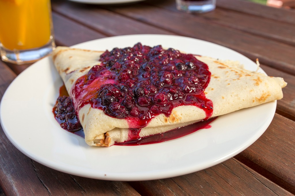 Miután mindezen túl voltunk, úgy gondoltuk, nincs más hátra, csak a nasi. Nyár, tópart, zöld - akármennyit is gondolkodnánk, releváns válaszként csak a palacsinta jutna eszünkbe, mint az egy igaz desszert egy jó kajálás után. Ezt a klasszikust itt egy kicsit feltuningolták (750 Ft), így kaptuk a képen látható hajtogatott csodát, a belsejében túróval töltve, és gazdagon megpakolva erdei gyümölcsökkel.