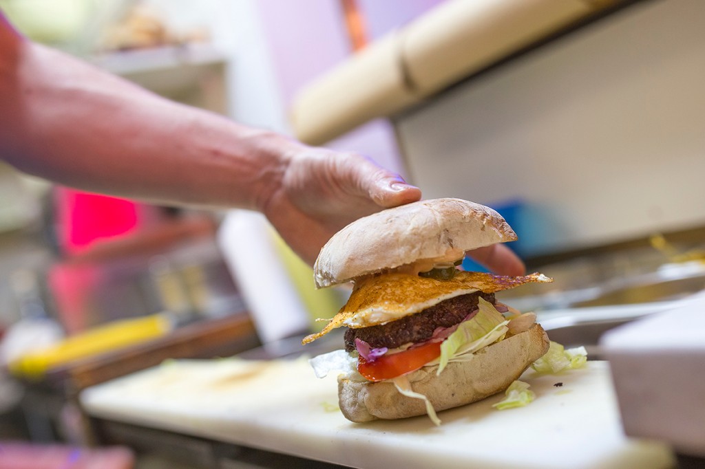 És, hogy milyen burgereket kóstoltunk végül? Az első egy klasszik volt (1240 Ft), sajttal-baconnel, paradicsommal, salátával, hagymával, és a speckó házi szósszal. A második versenyző egy ciabattában érkezett, és tükörtojással, valamint jalapeno-karikákkal volt szerelve. Természetesen nem maradhatott el a fentebb említett verseny díjnyertese sem, azaz az EgetVelő burger sem (1390 Ft), amelyben sertésvelő adja a másik pofont. A quesadilláról és az oldalasosról már megemlékeztünk, mellé pedig a házi hasábot (290 Ft) házi szószba, barbecueba, citrusos majonézbe, füstös chipotle szószba, vagy az Up to million fantázianevű asztalcsapkodóan csípős öntetbe mártogathatjuk. Ez után tuti szükségünk lesz némi házi szörpre vagy limonádéra – az az egy szerencsénk, hogy az is akad.