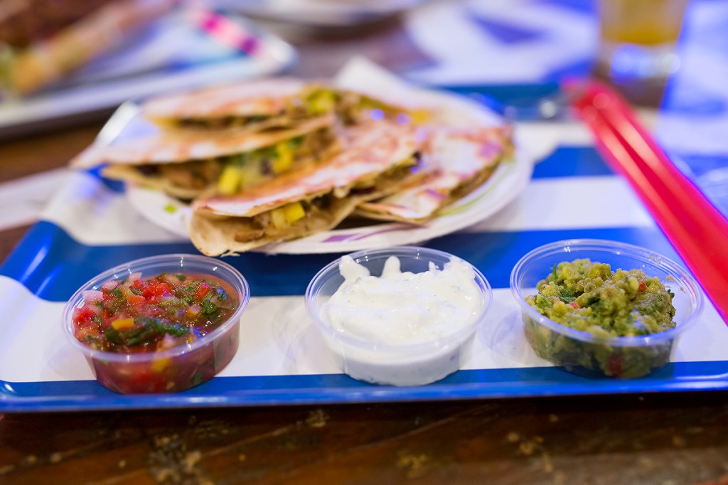 Most kivételesen nem álltunk meg a burgereknél, hanem lett egy jó kis érlelt sertésoldalasos szendvics, házi barbecue-szósszal, kifliben. Úgyszintén elkészült az új étlap hírnökeként egy quesadilla is, benne minden jóval, azaz mangóval, babbal, korianderrel, tejföllel, salsával és avokádókrémmel, na meg benne egy kellemes adag pácolt, grillapon elkészült csirkemellel.