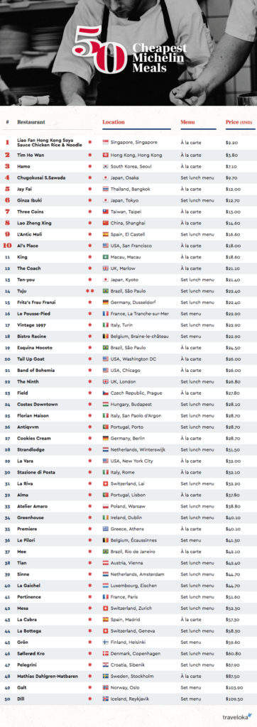 A lista élén egyébként a szingapúri Liao Fan sült kacsája szerepel, amiből egy tál olyan 800 forintot kóstál. Írtunk is róla.