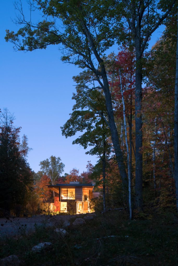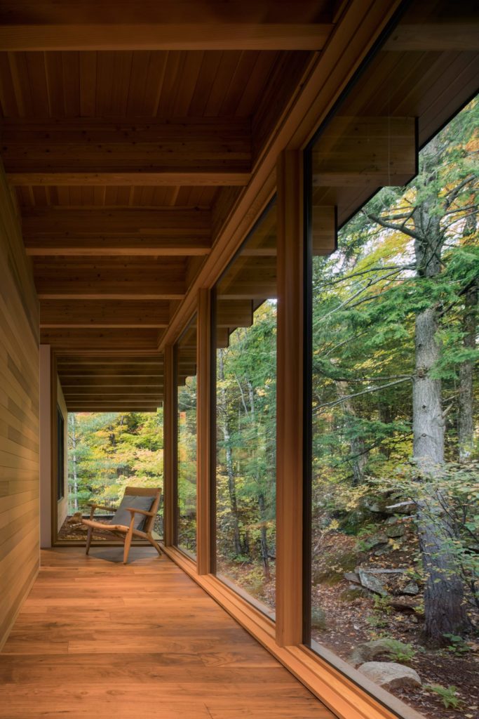 A hatalmas kanadai házat gyönyörű üvegfalakkal alkották meg, hogy lakóit a nappaliban is körülölelje az erdő, belül pedig harmonikus és minőségi bútorokkal rendezték be. Japános építészeti stílusjegyeket fedezünk fel benne itt-ott, ami nagyon nem vált hátrányára ennek a pazar épületnek.
