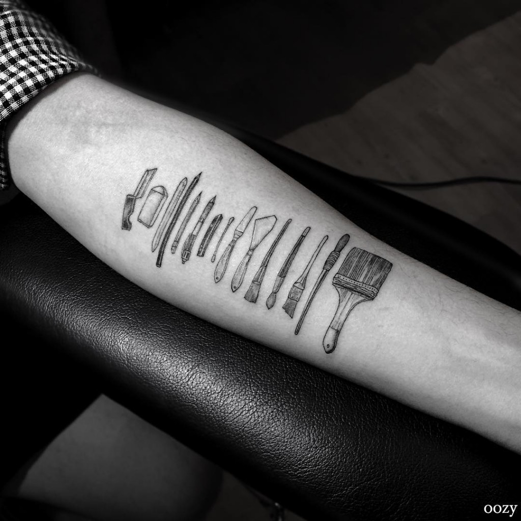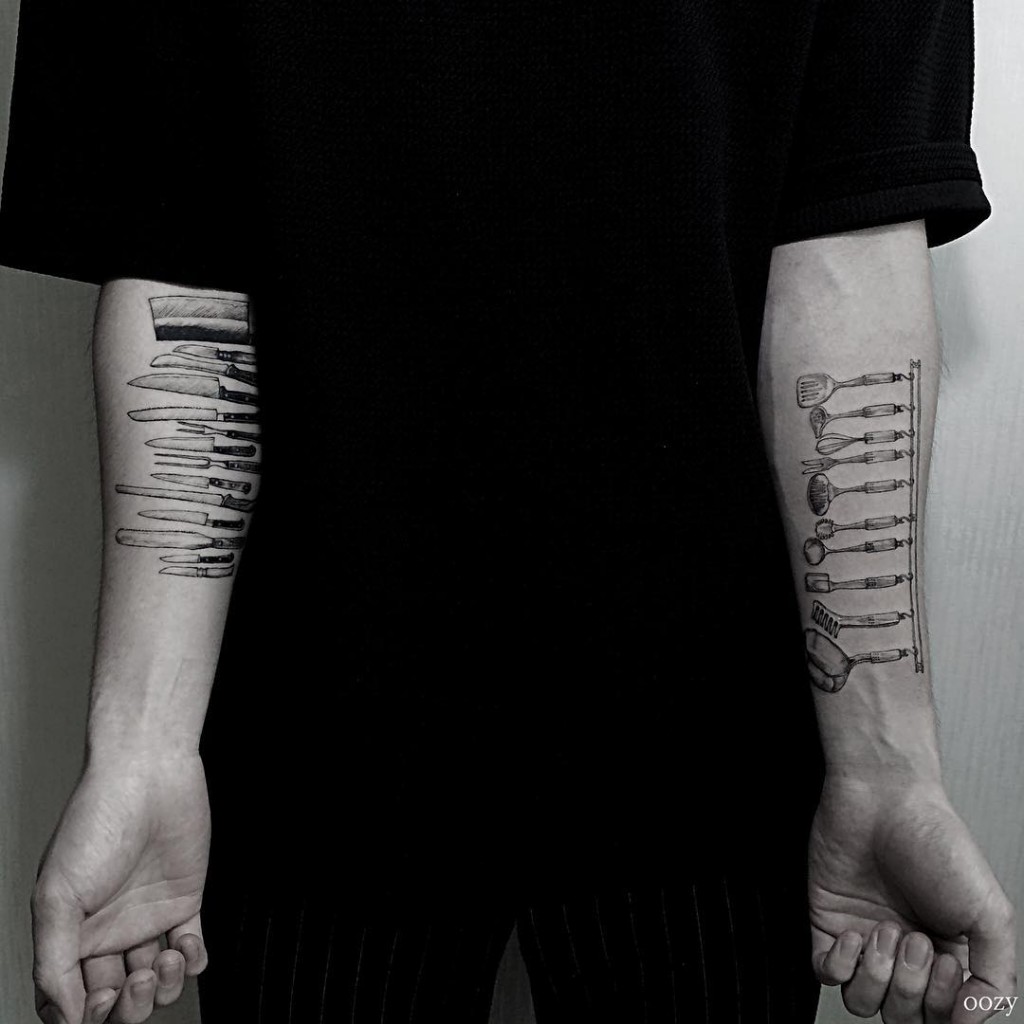 Oozy, egy dél-koreai tetoválóművész elegáns és minimalista tetkókon varrja rá az emberekre a foglalkozásukhoz szükséges eszközöket. Legyen az szakács, szobafestő vagy épp favágó, ezeket a tetkókat újságíróként is simán elfogadnánk.
