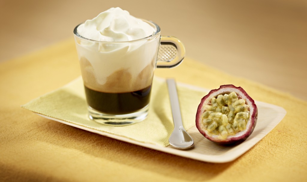Elkészítés: öntsd az 1 dl tejszínt és a maracujaszirupot egy mixerbe vagy habszifonba, majd készítsd el a tejszínhabot. Főzz egy adag espressót a Volluto Decaffeinato Grand Cru kávéból egy lungós csészébe, és adagold hozzá az ízesített tejszínhabot. A tetejét díszítheted maracuja darabbal.