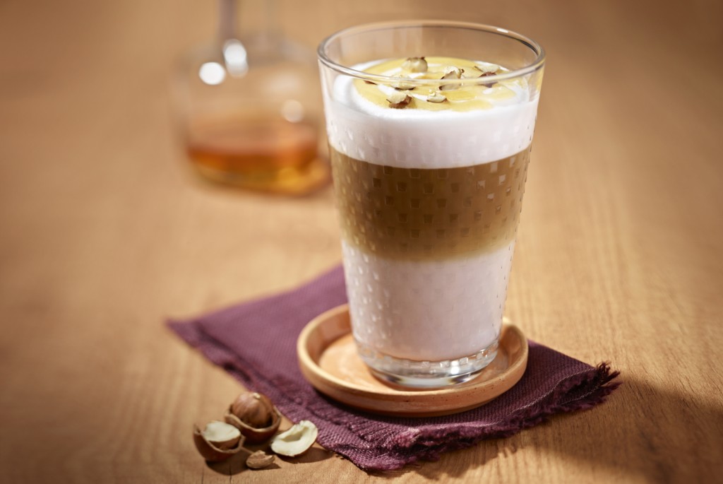 Elkészítés: töltsd egy nagy, receptes pohár aljára a mézet és a fügeszirupot. Készíts egy adag tejhabot az Aeroccino készülékkel vagy a kávégéped gőzölő funkciójának segítségével, majd adagold a pohárba, ügyelve a rétegek megtartására. Főzz rá egy adag hosszúkávét a Linizio Lungo Grand Cru őrleményből, majd díszítésképp szórj a tejhab tetejére tört mogyorót.