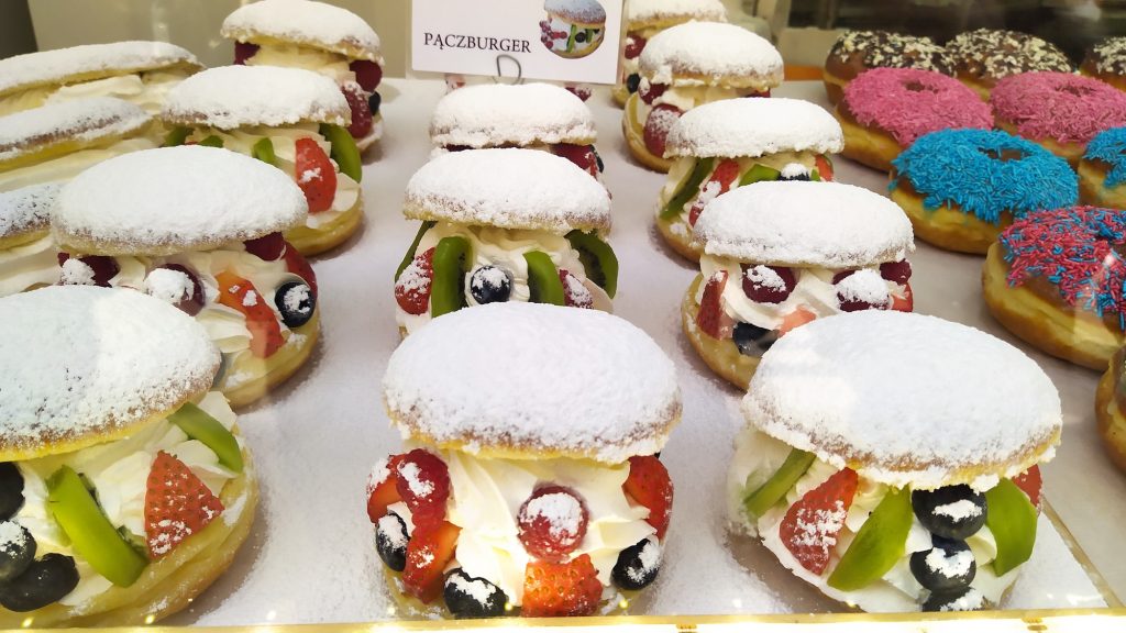 Még „fánkburgert” is láttunk, gazdagon díszítve még több édességgel, a körtés, áfonyás, sajttortás (mi ezt a változatot vállaltuk be, a tetején ropogós csokimázzal, pont olyan finom volt, amilyennek kinéz), epres, barackos, satöbbis fánkok pedig minden sarkon jelen vannak. Így: