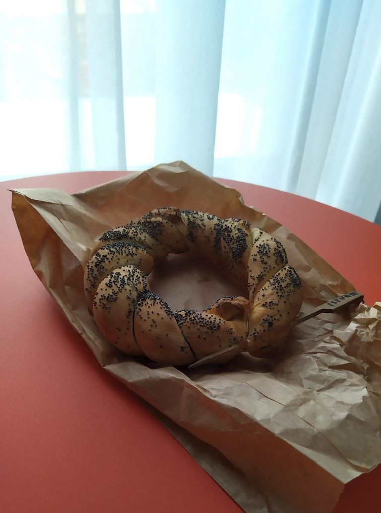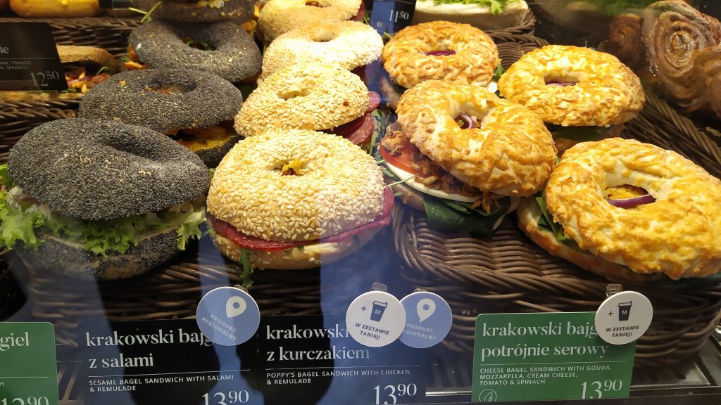 Szokás még Krakkóban mákkal megszórni a különféle péktermékeket, de nemcsak az édességnél, hanem a perec helyi tesóinál, az obwarzaneknél és a bagelnél is. Ettünk olyan mozarellás, ruccolás, paradicsomos, mustáros bagelt, ami mákkal volt meghintve, és meglepően laktatósnak bizonyult a méreteihez képest. Itt balra:
