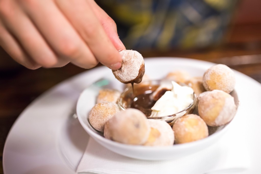 Eszünkbe sem jutott, hogy ennyivel megúsznánk, főleg úgy nem, hogy felbukkant Laci signature desszertje, amely Csokigolyók (590 Ft) fantázianévre hallgat, és kábé az egyik legjobb etűd, amit életemben desszert címén kaptam – megpróbálom elmesélni. Szóval úgy nézett ki a dolog, hogy volt jó sok minifánkgolyó, ez megtöltve mogyorókrémmel. Már ez is elég lett volna, de még tovább mentünk ennél, ugyanis meg voltak szórva fahéjjal, és kaptunk mellé egy tálkában csokiöntetet is, meg egy kis fagyit, mert miért ne. Ha nem fenyegetett volna a veszély, hogy kidurranunk, azt hiszem, még most is ott ülnénk és eszegetnénk.